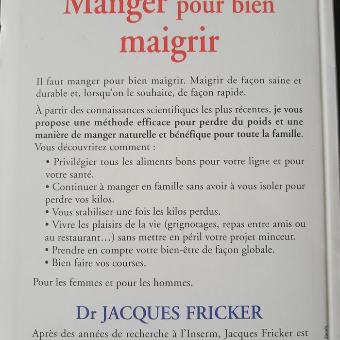 Manger pour bien maigrir Il faut manger pour bien maigrir. Maigrir de façon saine et durable et, lorsqu'on le souhaite, de façon rapide. À partir des connaissances scientifiques les plus récentes, je vous propose une méthode efficace pour perdre du poids et une manière de manger naturelle et bénéfique pour toute la famille. Vous découvrirez comment : • Privilégier tous les aliments bons pour votre ligne et pour votre santé. • Continuer à manger en famille sans avoir à vous isoler pour perdre vos kilos. • Vous stabiliser une fois les kilos perdus. • Vivre les plaisirs de la vie (grignotages, repas entre amis ou au restaurant...) sans mettre en péril votre projet minceur. • Prendre en compte votre bien-être de façon globale. • Bien faire vos courses. Pour les femmes et pour les hommes. Dr JACQUES FRICKER Pensez à grouper vos achats livres : toute l’année pour 10 livres achetés c’est 50% de réduction 🎁 Beaucoup de livres cuisine, santé, bien-être, minceur et régimes alimentaires, médecines douces ou naturelles, quelques romans et livres enfants également dans mon dressing 👌 Mes autres livres 📚 #cloclodalolivres Mes produits beauté, santé ou bio #cloclodalobeauté #livresanté #santebienetre #regime #maigrir #santenaturelle #methodemaigrir #régimealimentaire #nature #bienêtre #sante #angoisses #douleurs #maladies #autoguerison #medecinealternative #medecinedouce #médecine #santé #santebienetre #santenaturelle #medecinealternative #médecine #medecinedouce #medecinenaturelle #douleur #antidouleur #soigner #livresanté #diététique #livrediététique #minceur #recettesminceur #