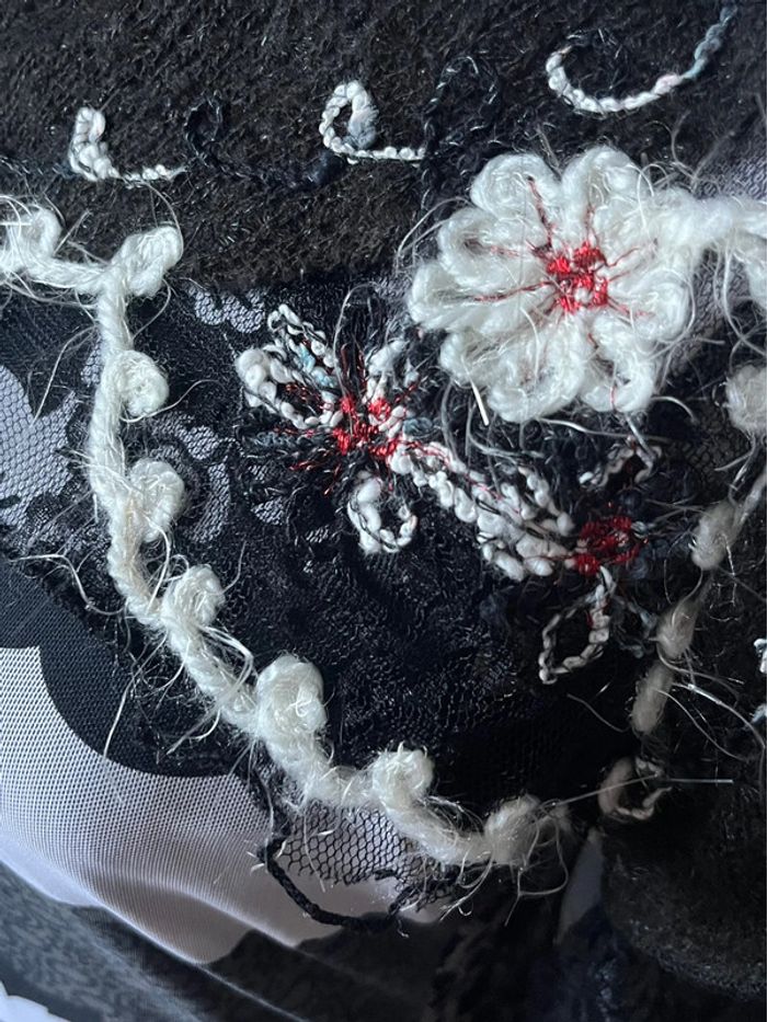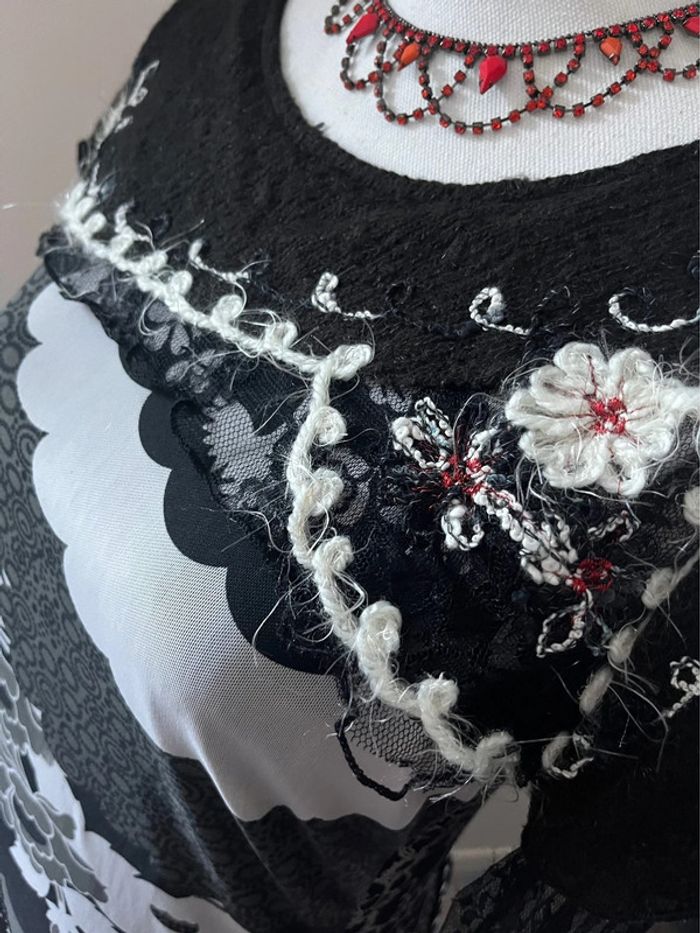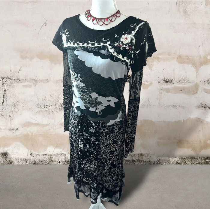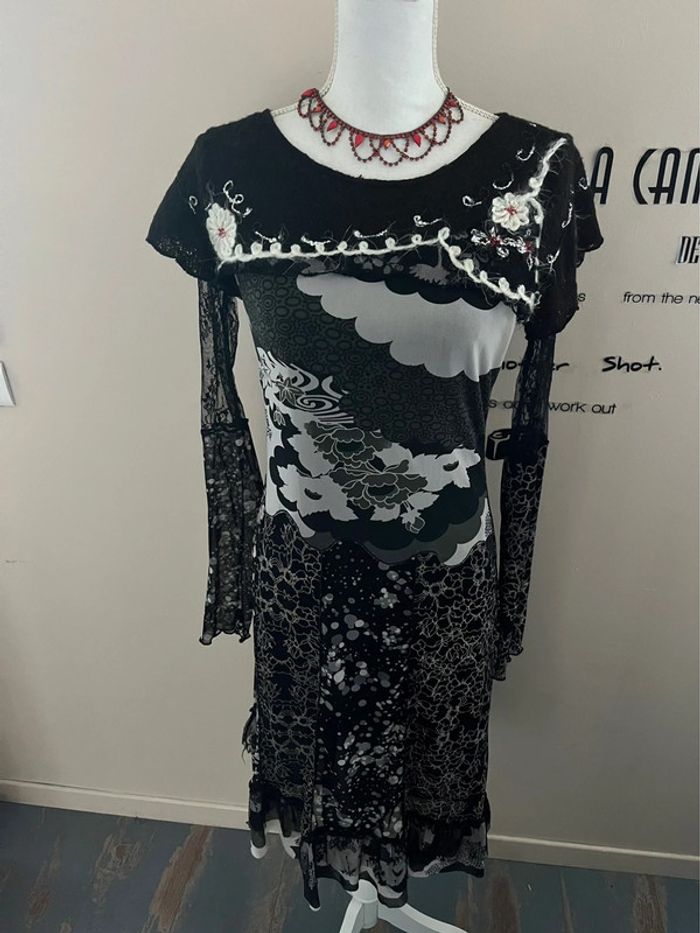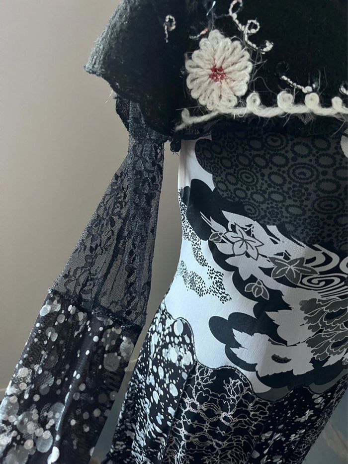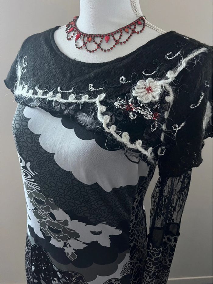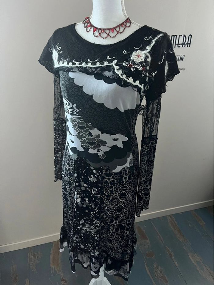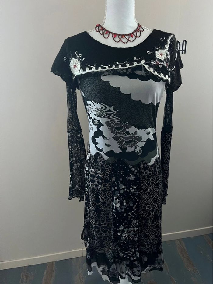 Magnifique robe chic d’hiver très originale en voile imprimé doublé sauf aux manches et pull boléro intégré en laine .