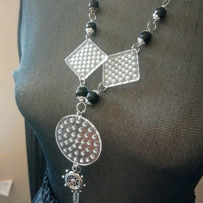 J'utilise pas mal de sautoirs et colliers fantaisie pour accessoiriser les photos de mon dressing et j'en ai accumulé beaucoup. Aussi j'ai décidé d'en mettre en vente une partie. Ils n'ont été portes que par mon mannequin donc. Celui ci est noir et argenté, avec des parties de formes géométriques en plexi transparent terminé par un pompon décoratif avec une roue de marin N'hésitez pas à faire des lots pour économiser les fdp. Envoi rapide et soigné 👍 Je réponds à vos questions si besoin de plus de précision avec plaisir. Mes autres bijoux #cloclodalobijoux Mes autres articles noir #cloclodaloblackdream Mes autres articles couleur argent #cloclodalosilverdream CONDITIONS DE VENTE N'hésitez pas à poser vos questions avant achat car je réponds volontiers et je suis très disponible mais je n'accepte pas les retours ensuite sauf erreur de ma part bien sûr ⚠️ Pensez aussi à faire des lots pour économiser les fdp et gagner des réductions intéressantes en période promo 💡 Je suis ouverte aux négociations raisonnables si demandées avec politesse pour les lots de plusieurs articles seulement . Bon shopping à tous 🤗 #bijouxfantaisie #bijouxboheme #collier #sautoir #sautoircoloré #sautoirlong #sautoirfantaisie #sautoirboheme #doublerang #perles #transparent #chaine #collierneuf #sautoirneuf #sautoirnoir #colliernoir #pompons #dark #stylegothique #gothiquelolita #gothique