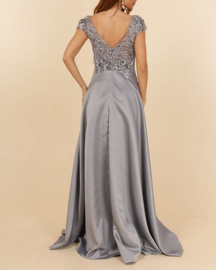 robe cérémonie dentelle et bas satiné argenté taille 38