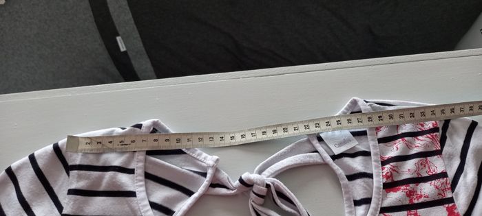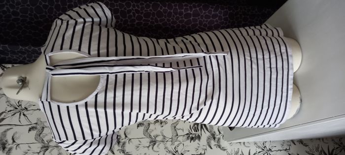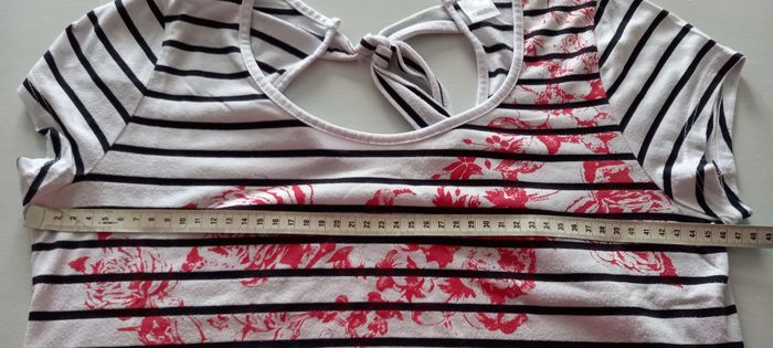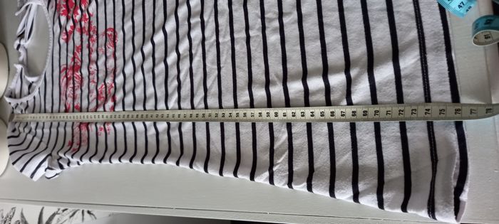 T-shirt long Camaieu Manches courtes Blanc rayé bleu avec motif rouge Nœud à nouer au dos Longueur 76 cm Largeur épaules 34 cm Largeur aisselles 46 cm Taille 42 #T42_imoddeco