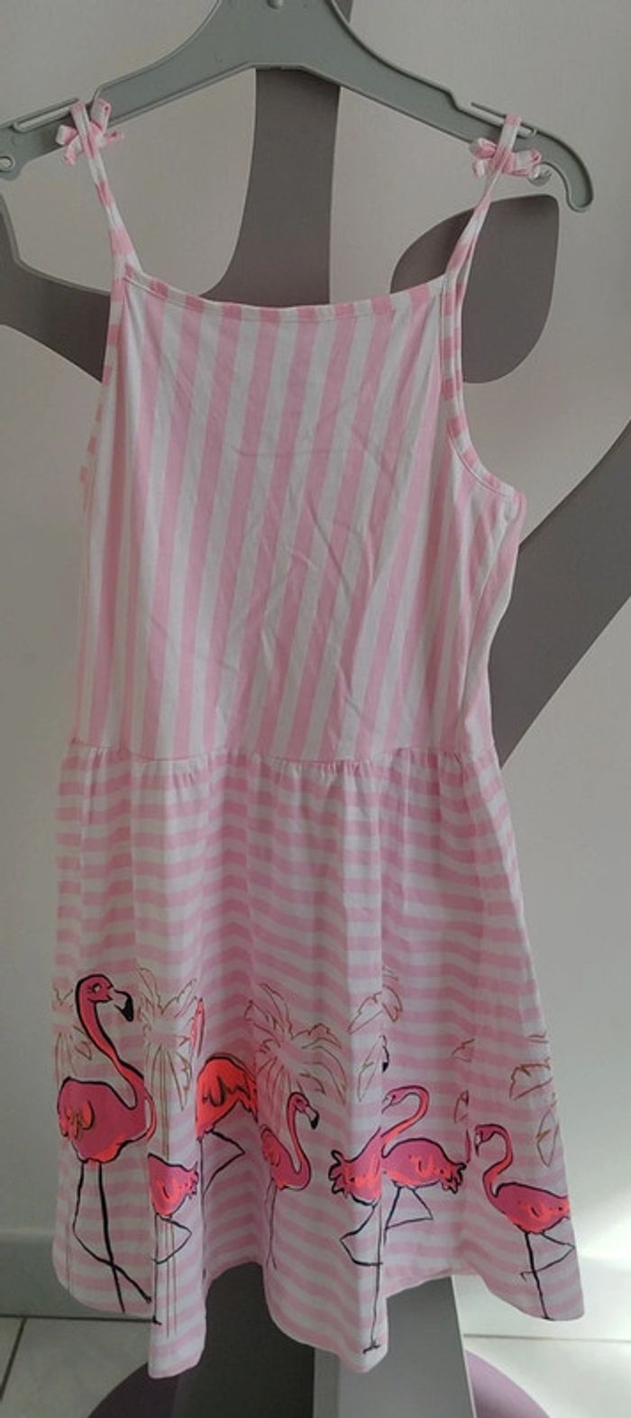 Robe à bretelles rose à rayures blanches thème flamand rose Palomino taille 10 ans - photo numéro 1