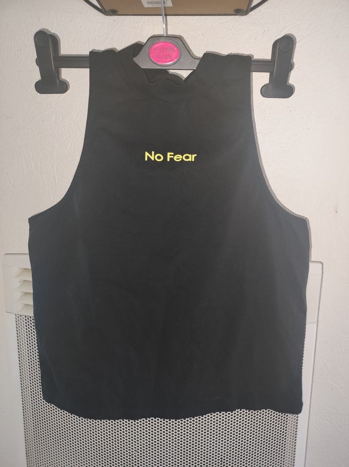 Débardeur taille S 16 ans du rayon enfant Kiabi noir écriture jaune fluo