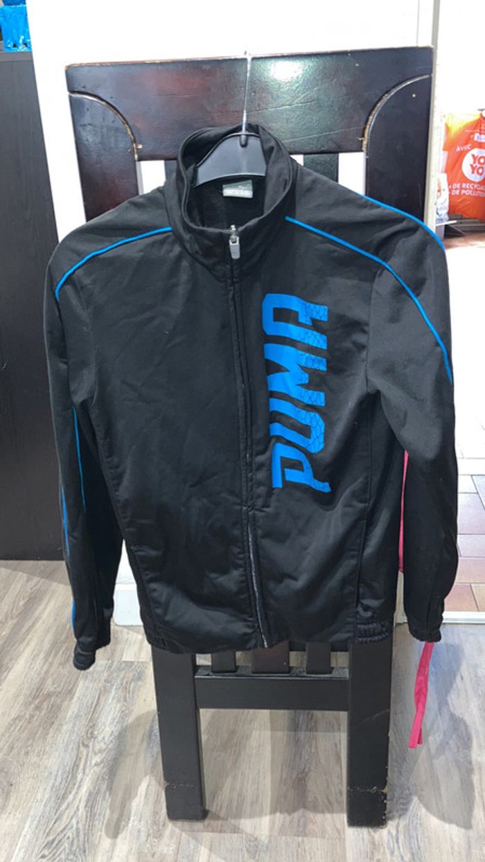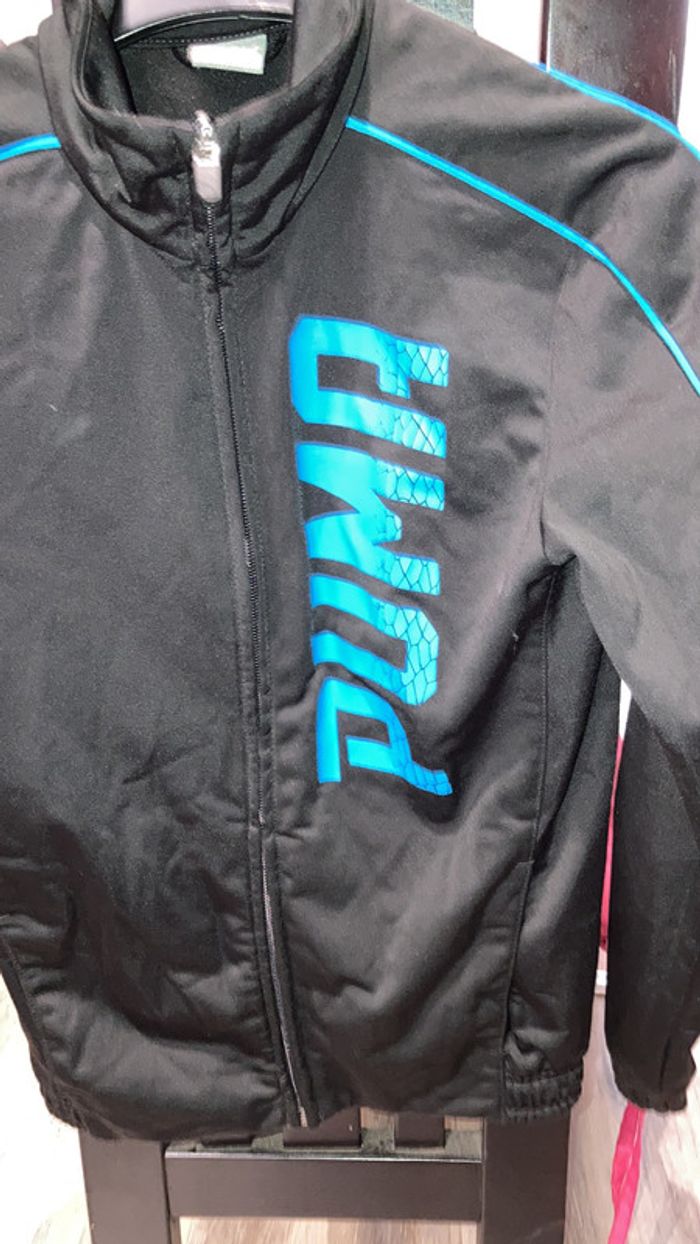 vend gilet sport taille 10 ans bon état marque puma noir écriture bleue.