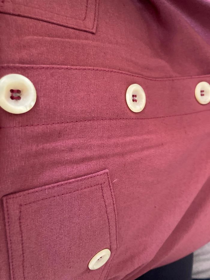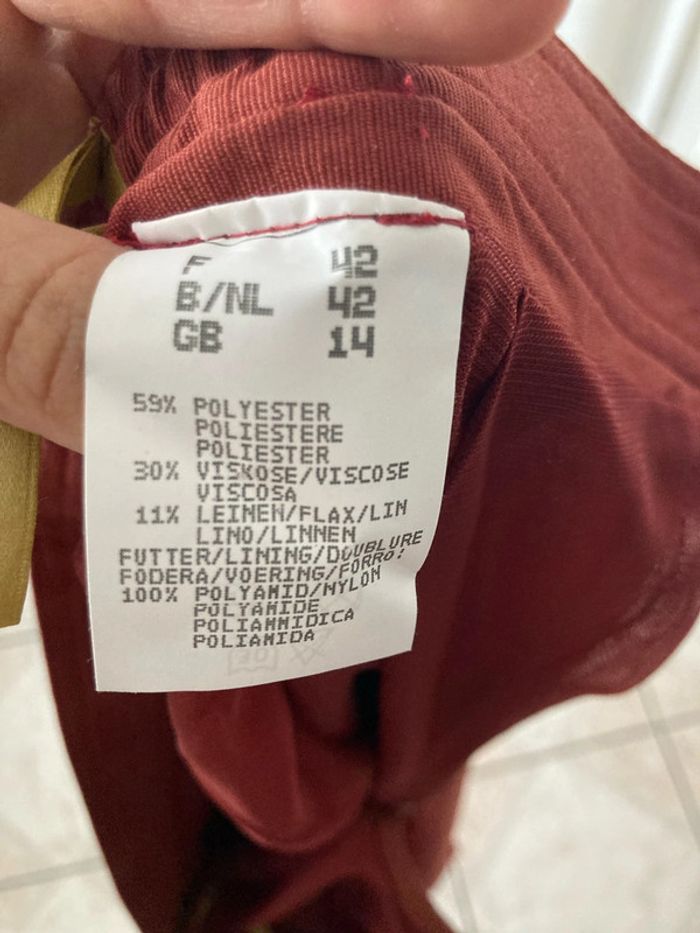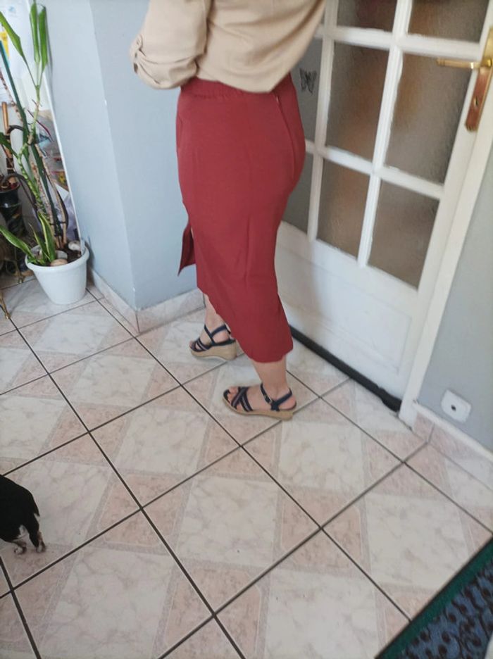 Vend jupe droite neuve taille 42 couleur brique se ferme derrière avec un zip et un bouton. Les boutons de devant sont décoratifs . Elle est doublée