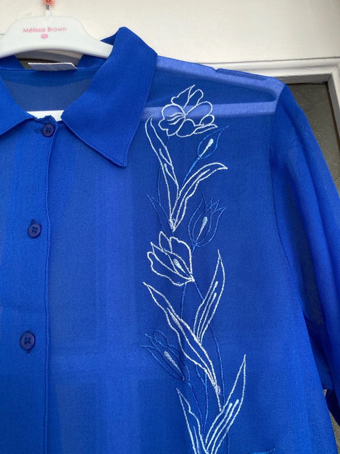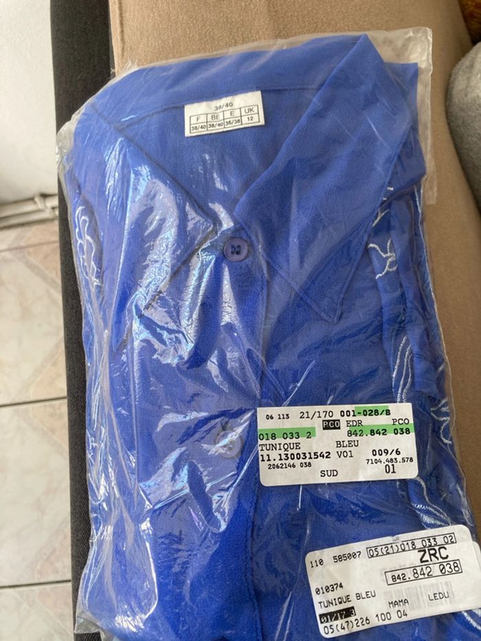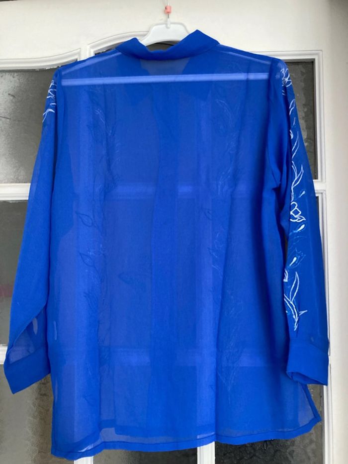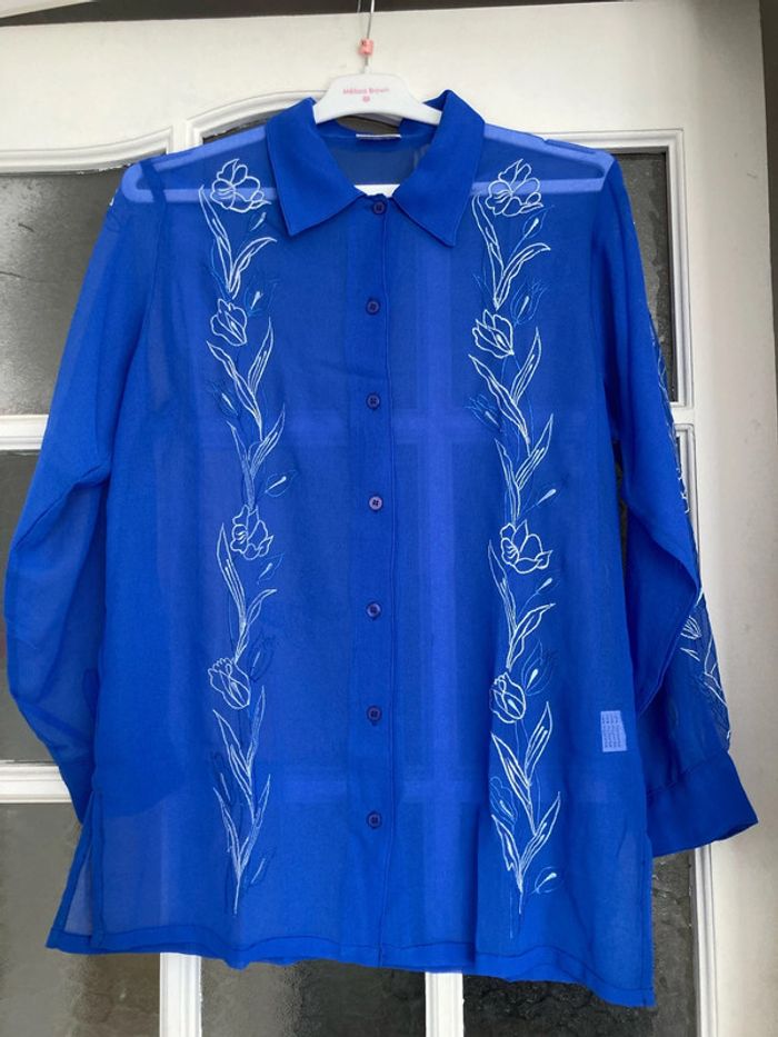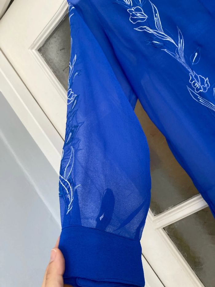 Vend chemisier bleu roi avec broderies transparent neuf dans son emballage d’origine.