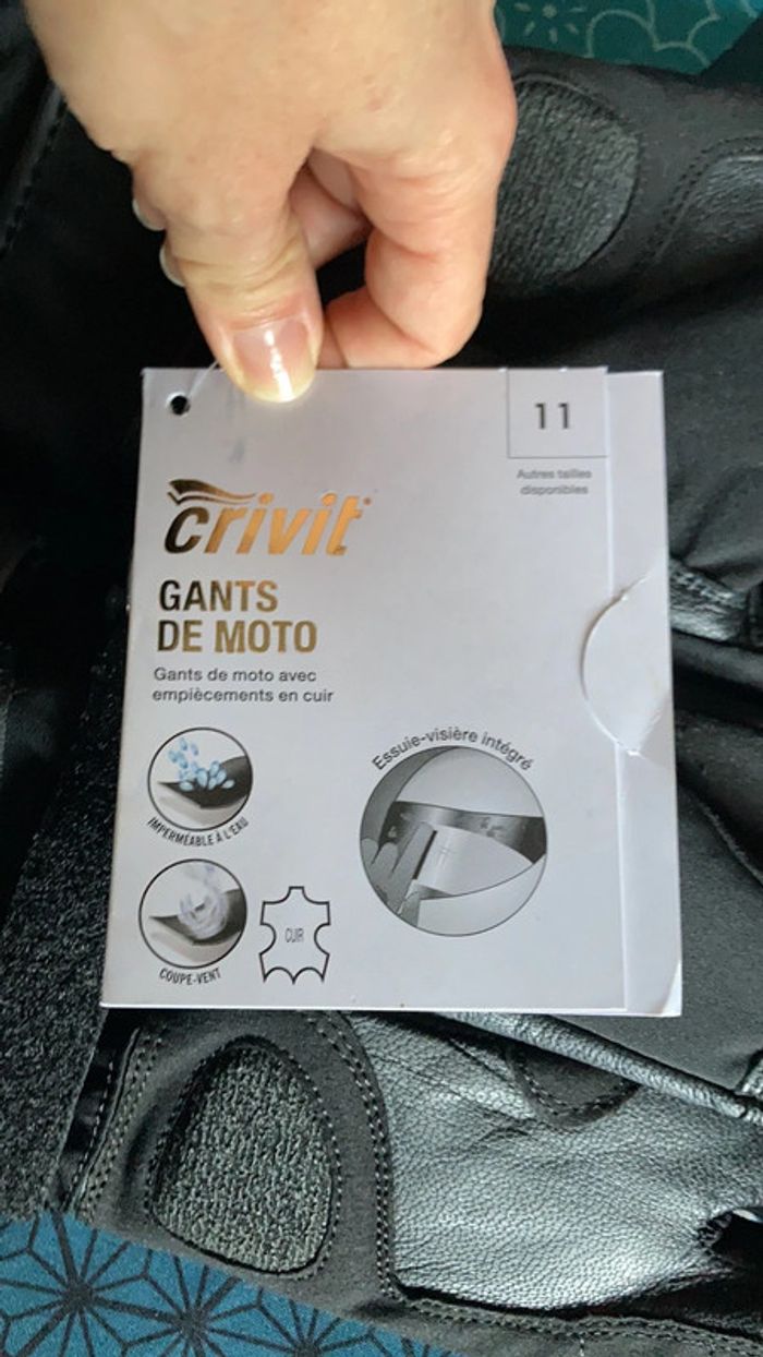 Vend paire de gants moto taille 11 neuf avec étiquette . Vendu car taille ne correspond pas. En cuir imperméables , essuie visière intégré.