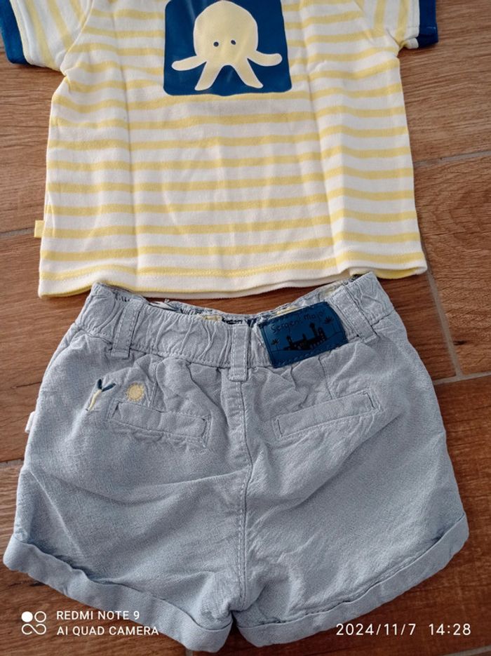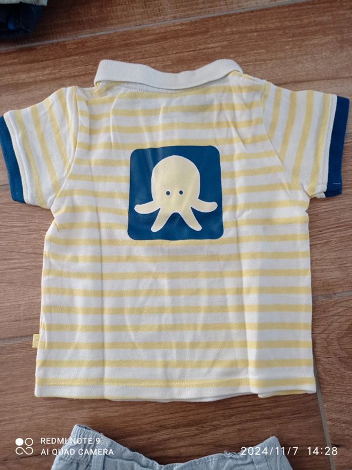 Ensemble 6 mois Short en Chambray Sergent major Polo rayé jaune paille/ blanc liseré marine et pieuvre dos Obaibi