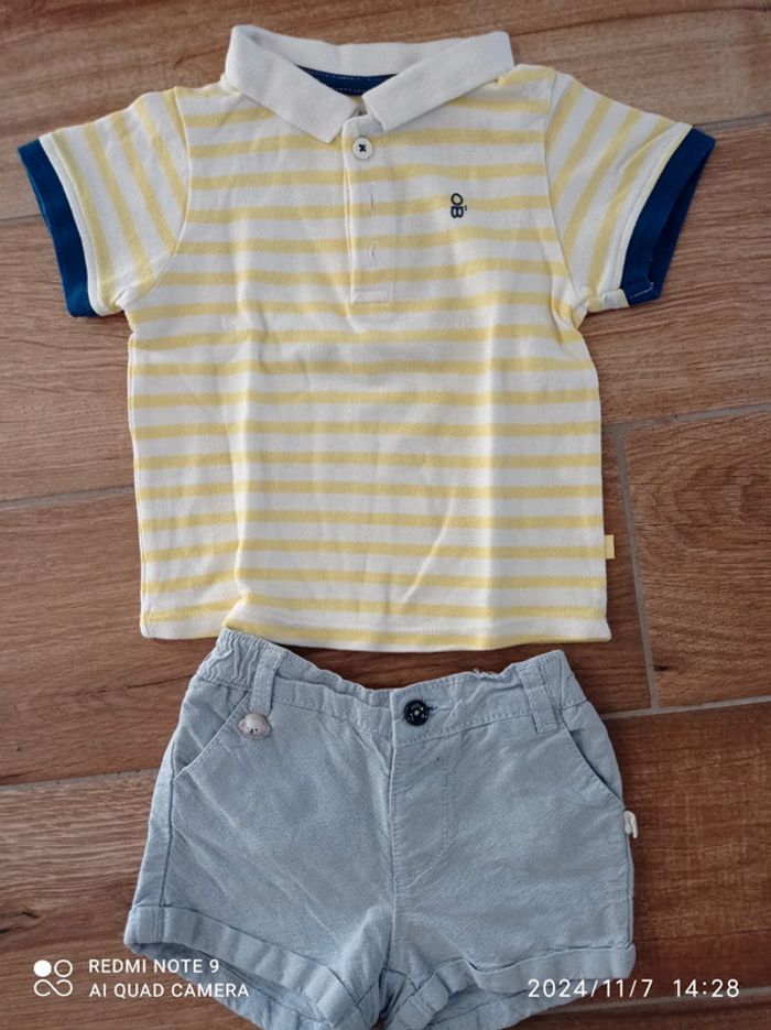 Ensemble 6 mois, short Chambray + Polo rayé blanc/jaune paille