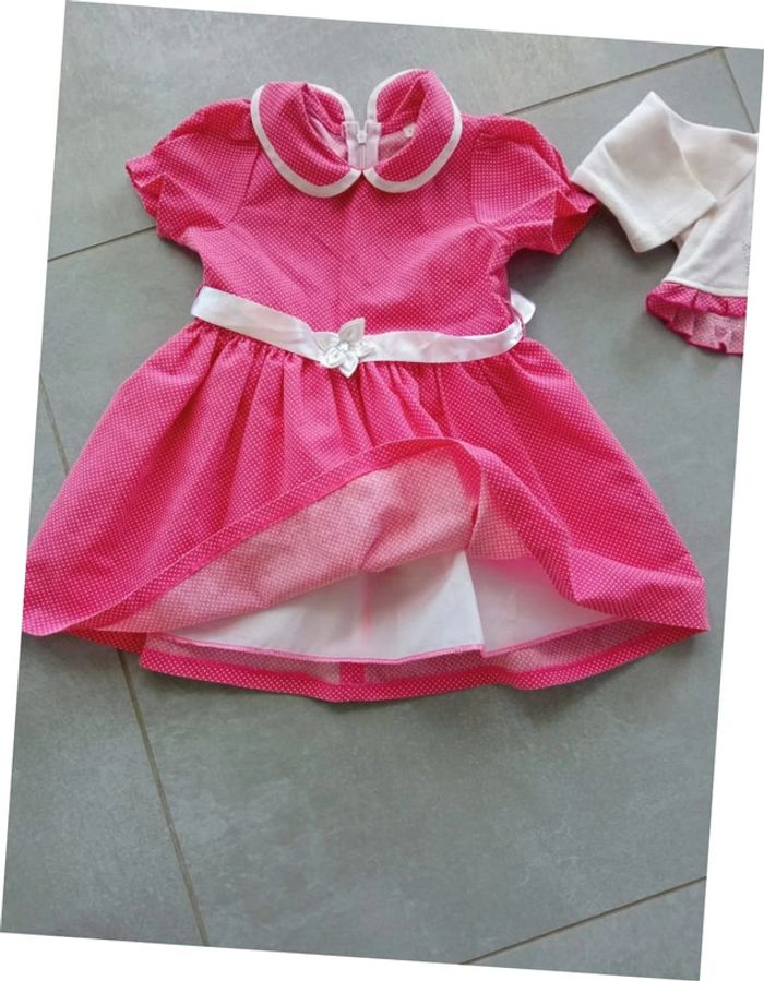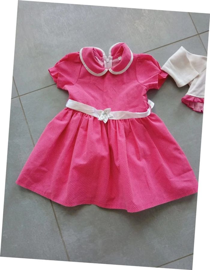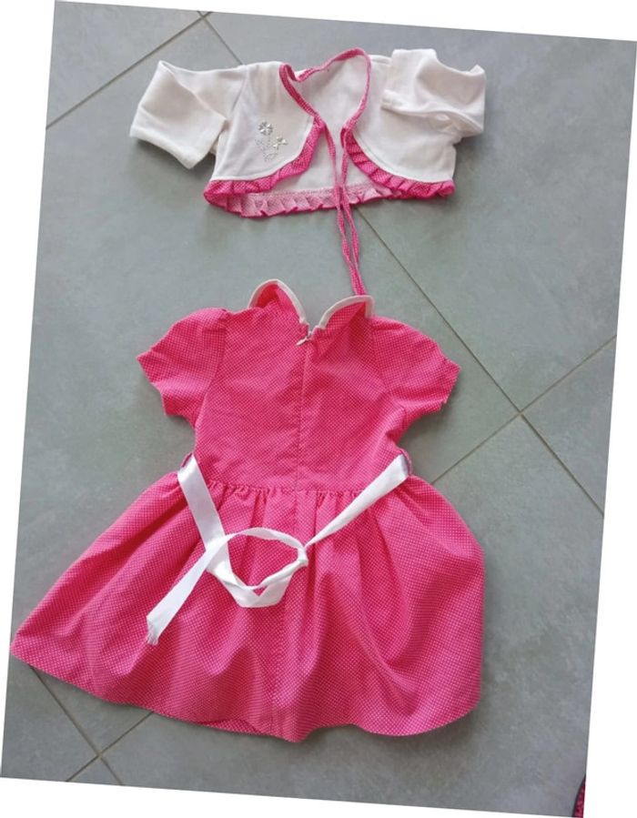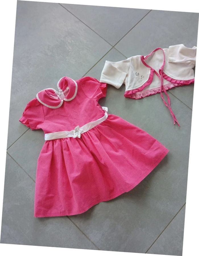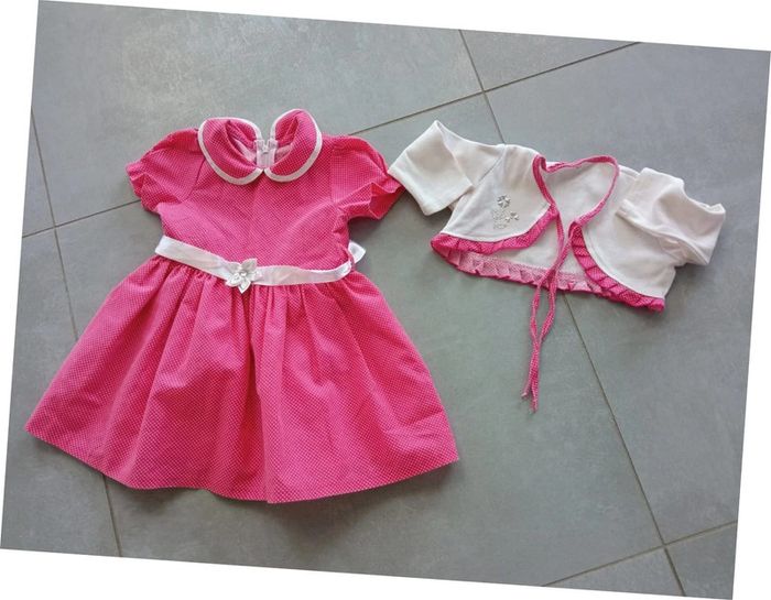 Très joli ensemble robe et caraco, la robe est doublée et fermée par un zip dans le dos. Très bon état. Taille : 1 an. Pour voir mes autres vêtements 1 an, cliquez sur #1anfillemadie57 Au cas où : regardez mon dressing, liens dans " à propos" pour amortir les frais d'envoi et avoir un meilleur prix pour le lot...