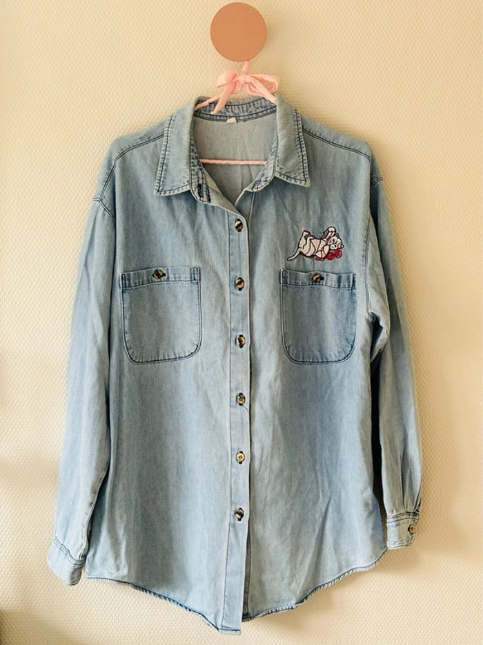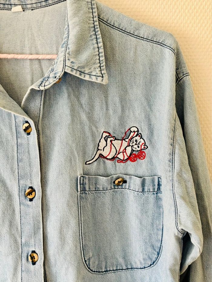 Chemise en jean 90’s avec son petit chat brodé Conviendra du 38 au 44 selon l’effet désiré au porté Patiné mais reste en bon état
