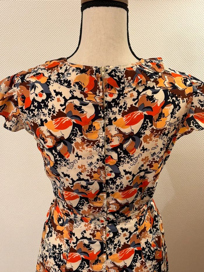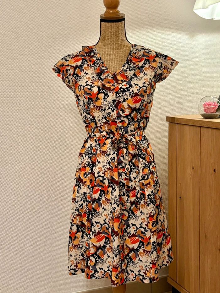 Magnifique petite robe vintage des années 60 Faite main, entièrement doublée avec fermeture éclair au dos Joli détail volanté au décolleté et aux épaules, petite ceinture pour souligner la taille Mesure épaule à épaule 39 cm Aisselle à aisselle 46 cm Taille 38 cm Longueur 95 cm