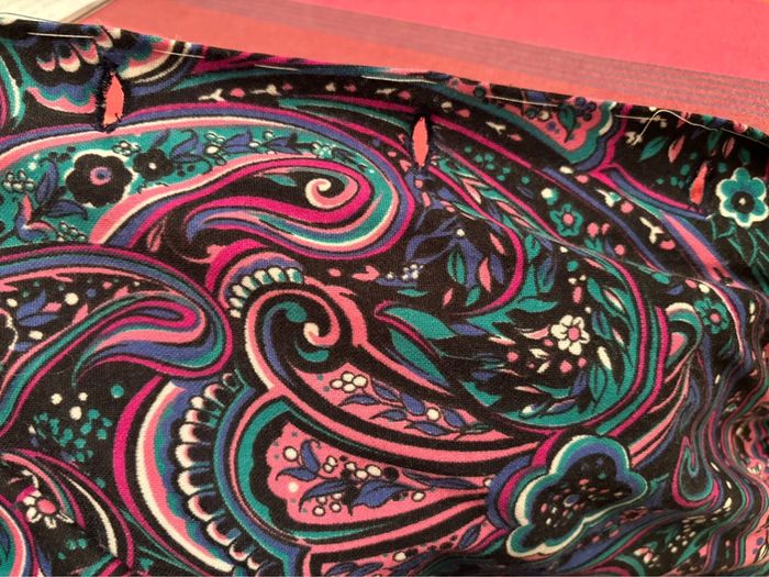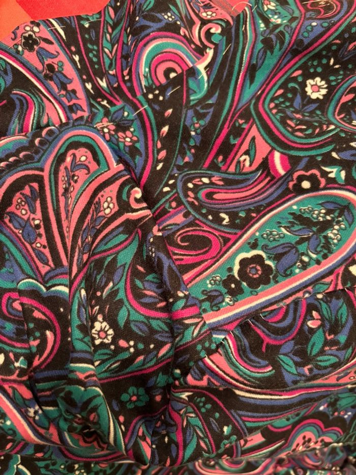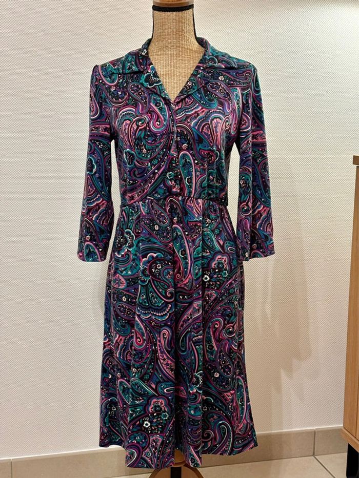 Robe vintage 70’s dont le projet couture n’a pas été totalement finalisé. Il reste à piquer à la machine les coutures comme le montre la photo et poser des boutons. Très joli tissu mais petit prix pour le travail à finaliser