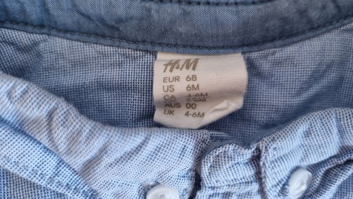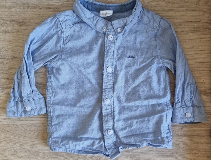 Chemise bleue manches longues avec une petite voiture en logo. Marque: H&M Taille: 6 mois En très bon état. Lavé lessive bébé
