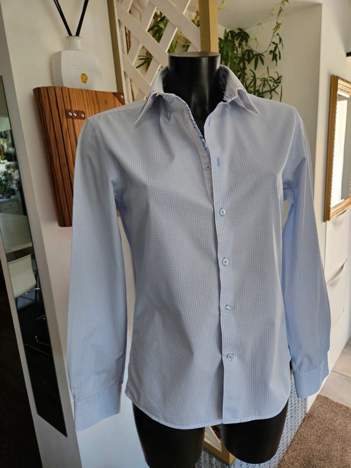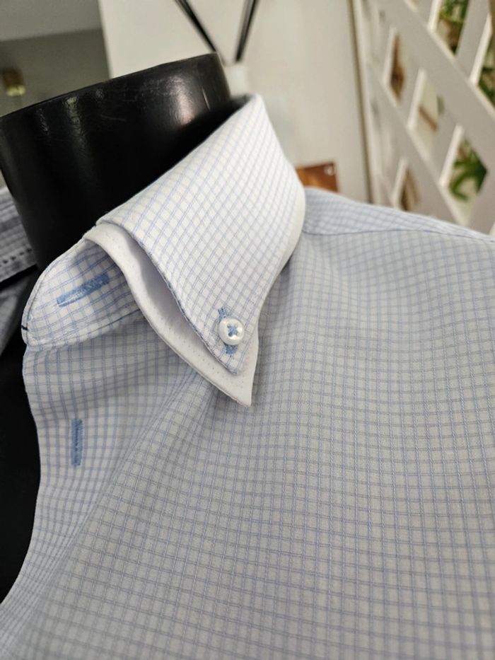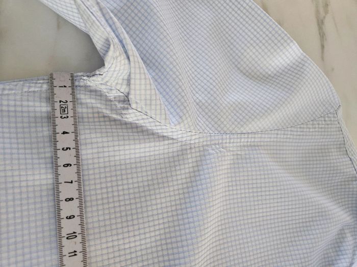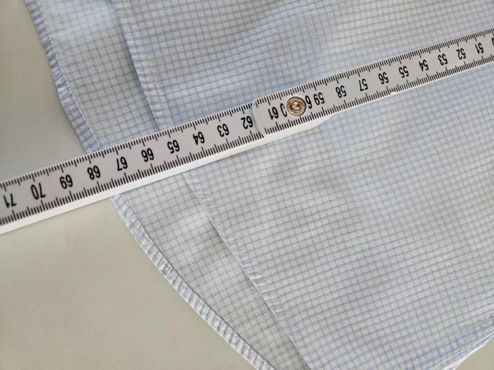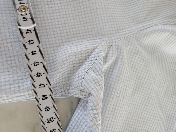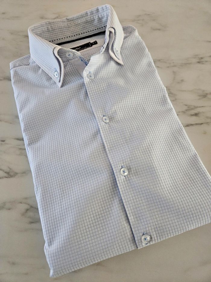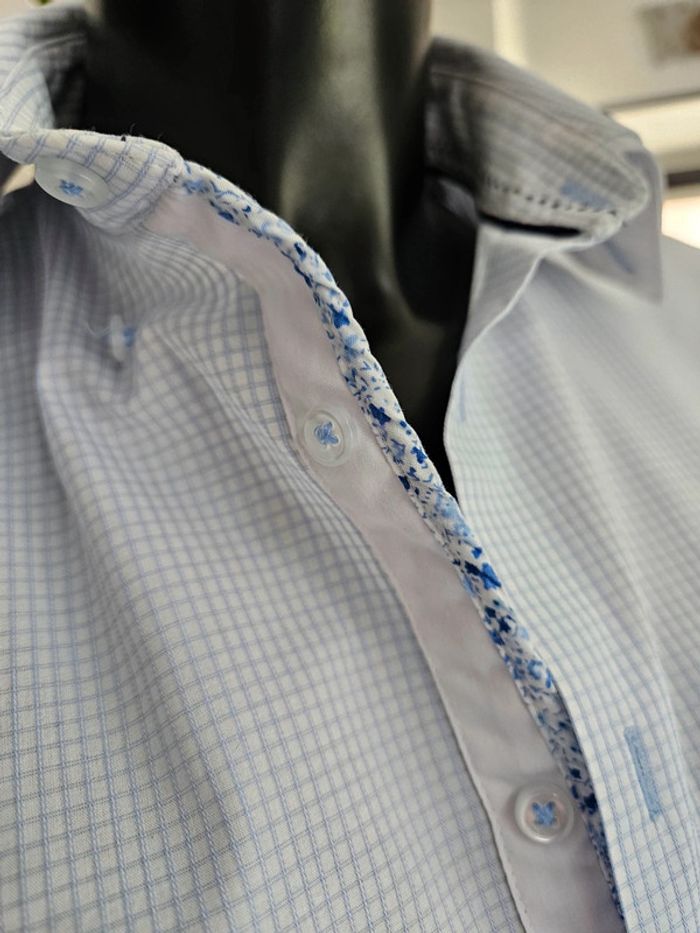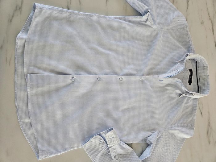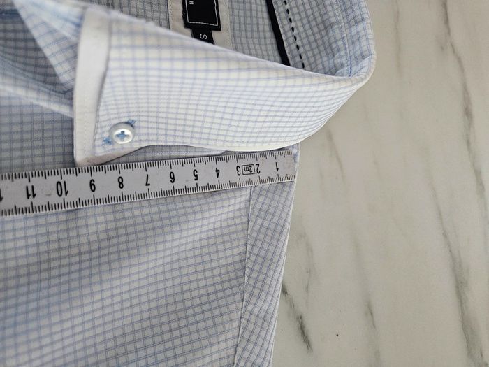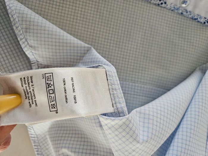 Chemise à petits carreaux bleus. Portée elle est en très bon état. Juste le col qui est vraiment légèrement marqué. Dimensions sur les photos