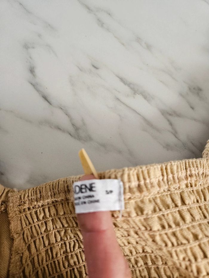 De couleur beige légèrement moutarde. Elle est neuve. S mais taille petite. Extensible dans le dos