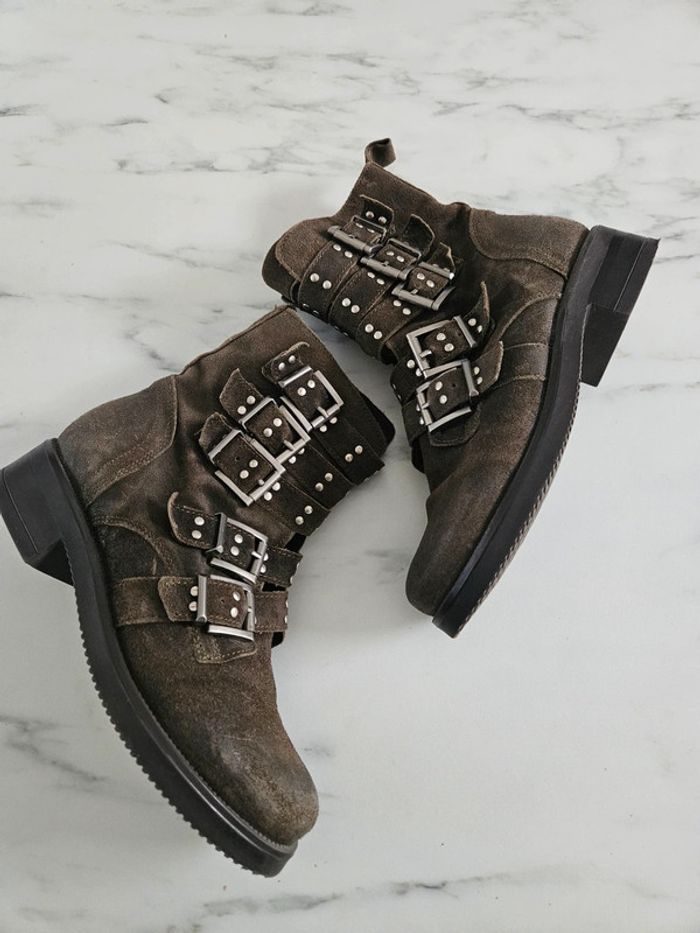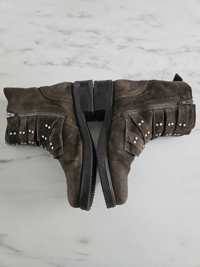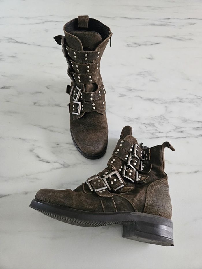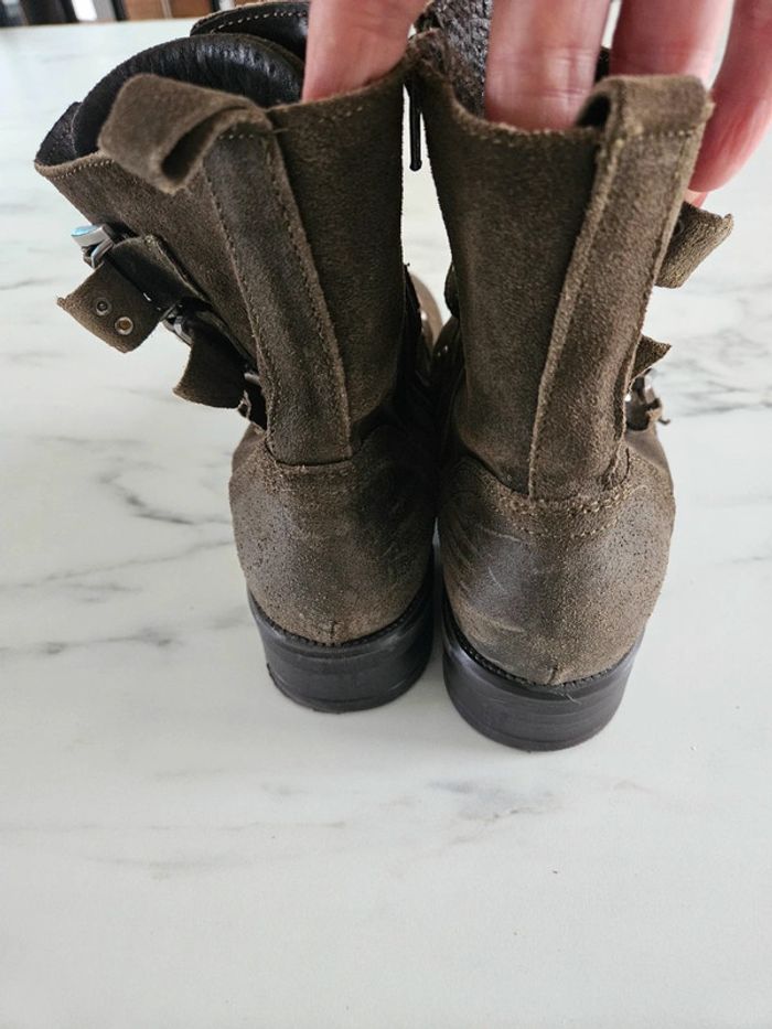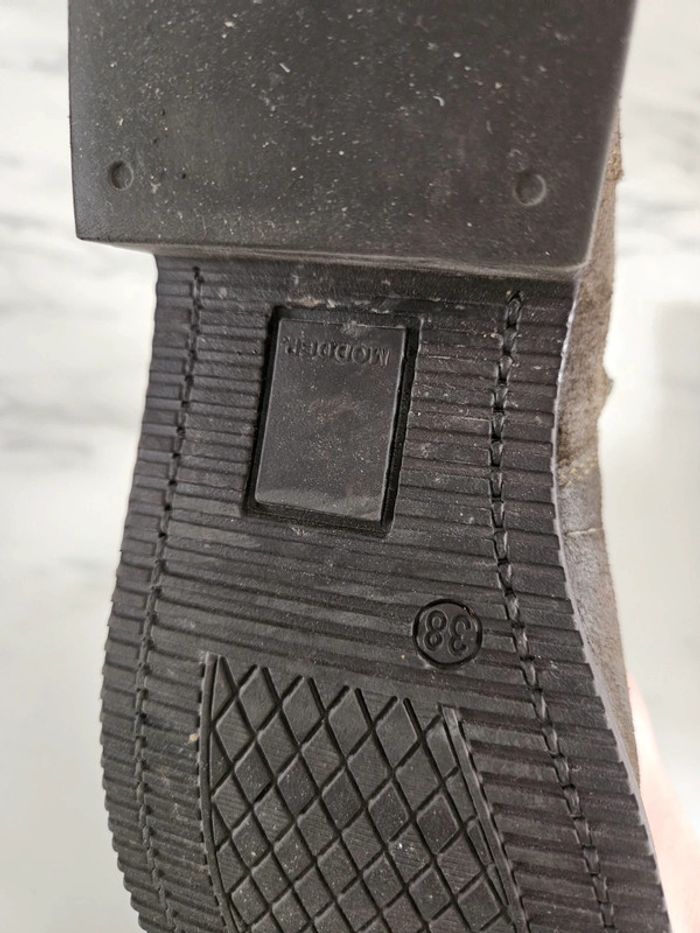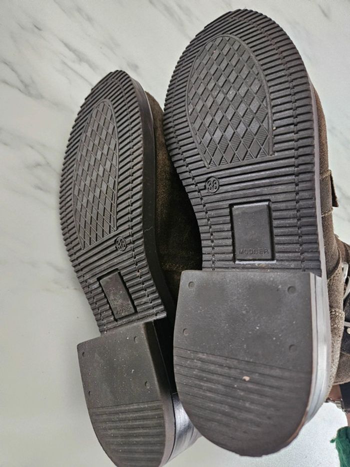 Entre marron et kaki pour la couleur. Portée mais elle reste en bon état