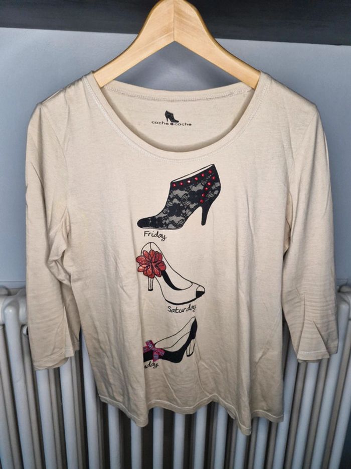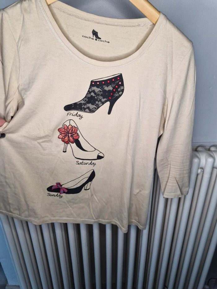 Tee-shirt beige manches 3/4 Imprimé chaussures Marque Cache Cache Pas d'étiquette de composition et de taille Correspond à un 42/44 Dimension à plat sous les aisselles : 56 cm Longueur totale de l'épaule au bas : 61 cm Réductions activées sur les lots ↘️ ✅️ 🤑 #taille42sofi1804 #taille44sofi1804 #teeshirtsofi1804