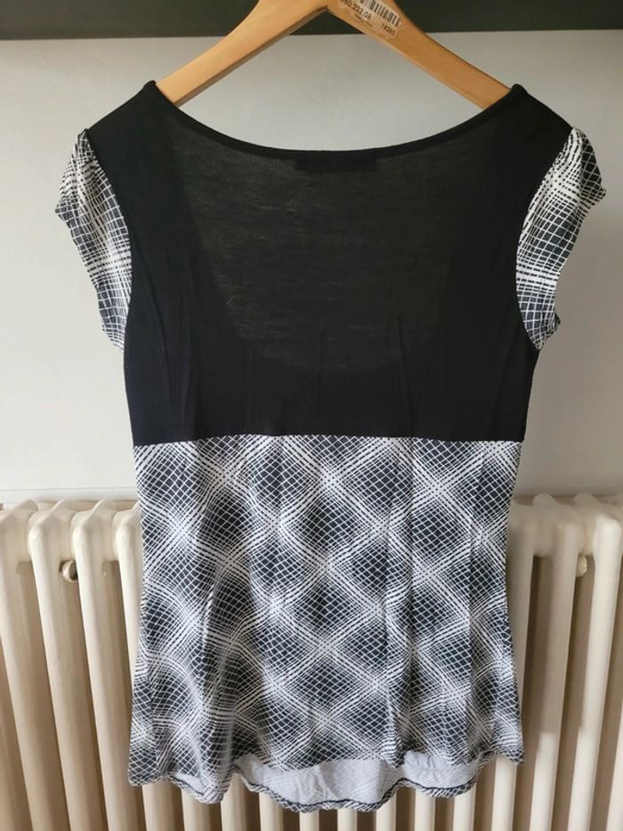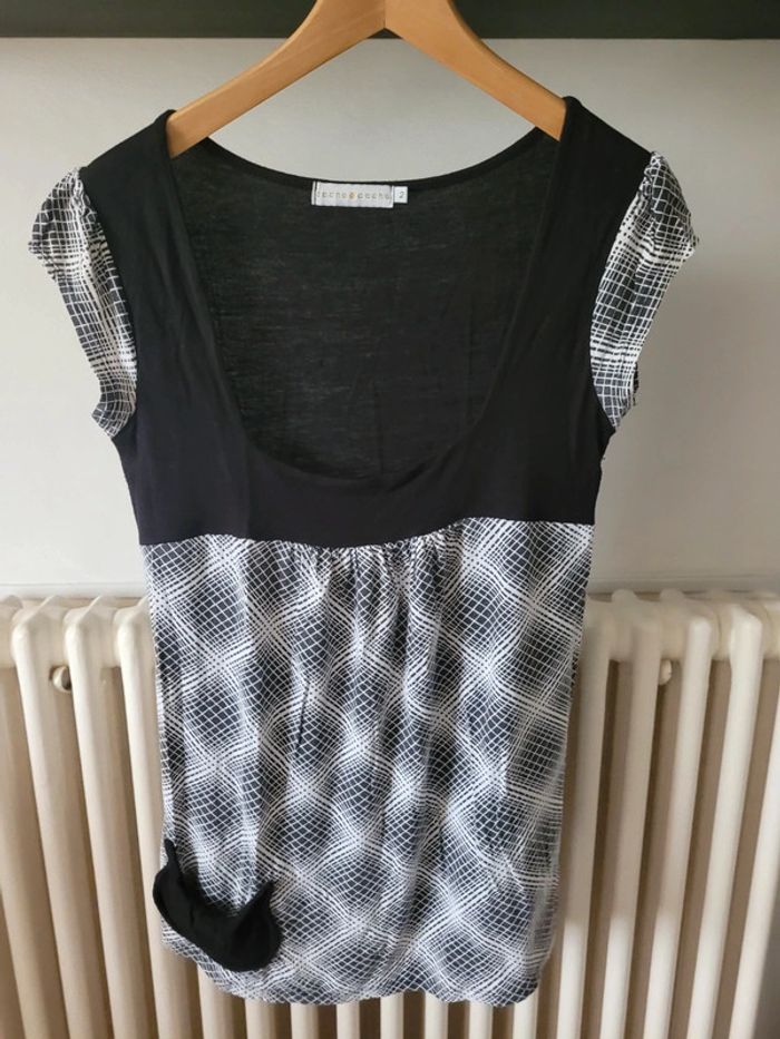 Tee-shirt noir et rayé Coupe empire, décolleté Taille 2 ou 38 Largeur à plat sous les aisselles : 44cm Marque Cache Cache Petite poche déco Pas d'étiquette de composition Réductions activées sur les lots ↘️ ✅️ 🤑 #taille38sofi1804