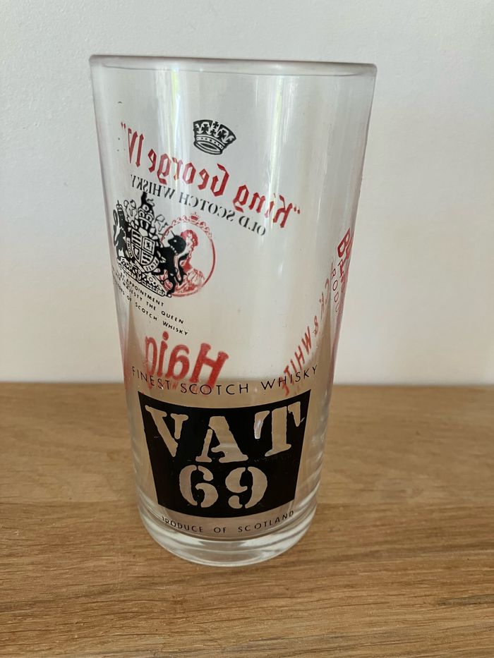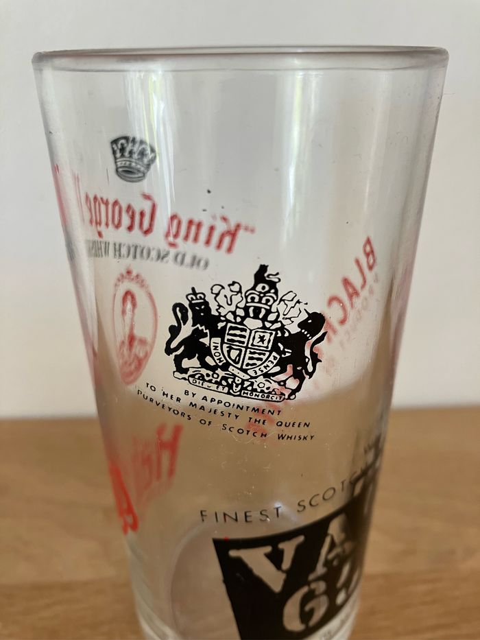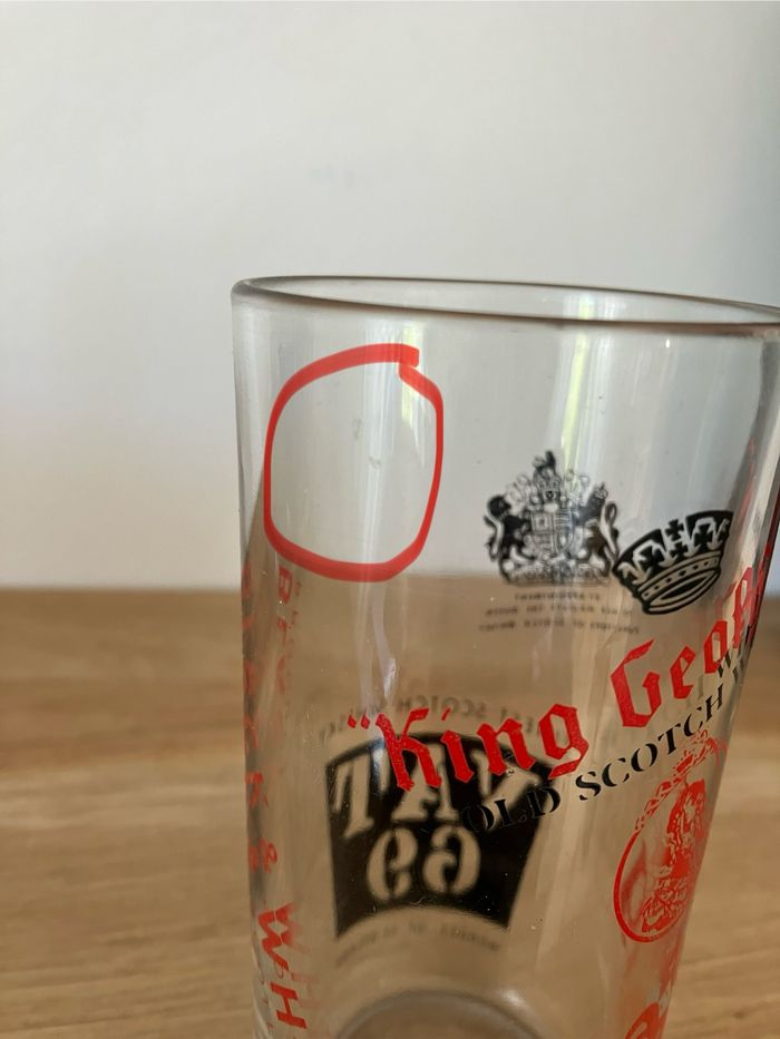 Verre à whisky portant plusieurs inscriptions de marques Il est en bon état : pas de fêlure ou d’ébréchure. Toutefois, 2 micro impacts très peu visibles (voir photo) L’écriture est un peu passée à certains endroits (voir photo) mais là encore très peu visible. Dimensions : - hauteur : 12 cm - diamètre : 6 cm