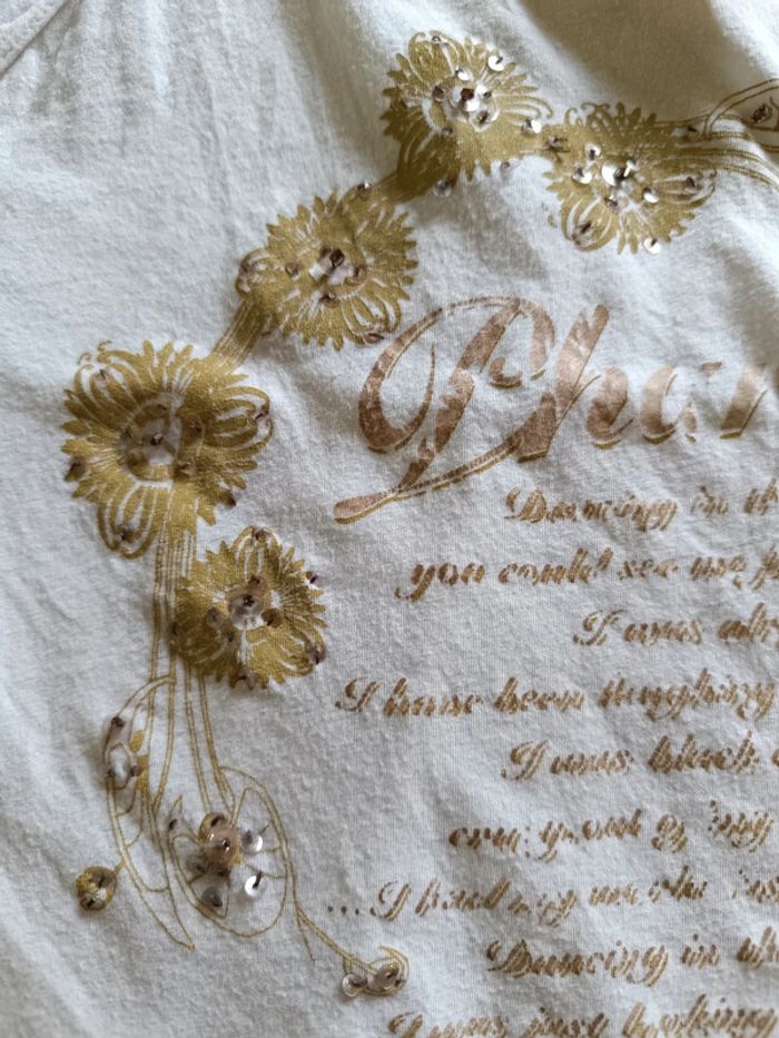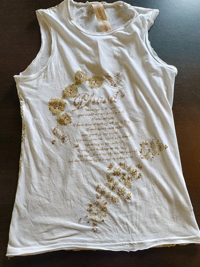 Débardeur PHARD Crème avec impressions dorées & sequins sur le devant Arrière crème avec impressions dorées Larges bretelles 89% Coton & 11% Elasthanne TAILLE L TRES BON ETAT Allez voir mes autres ventes!