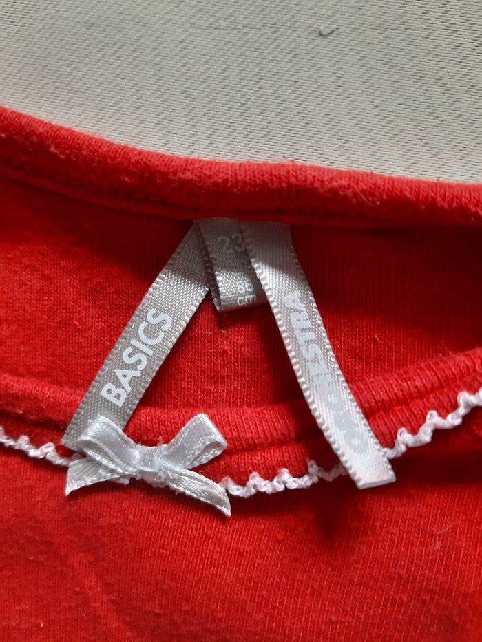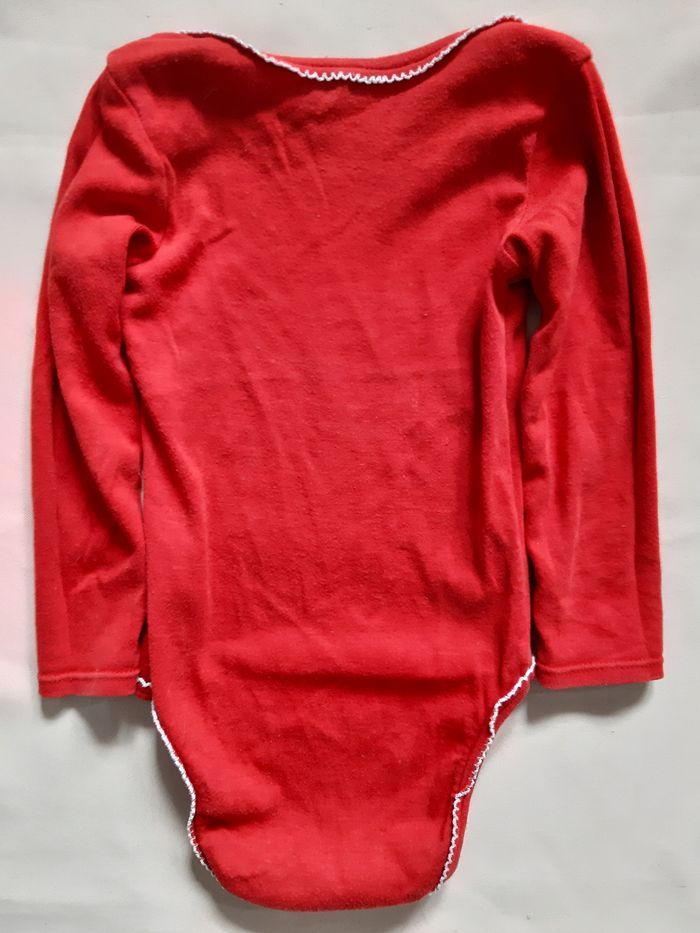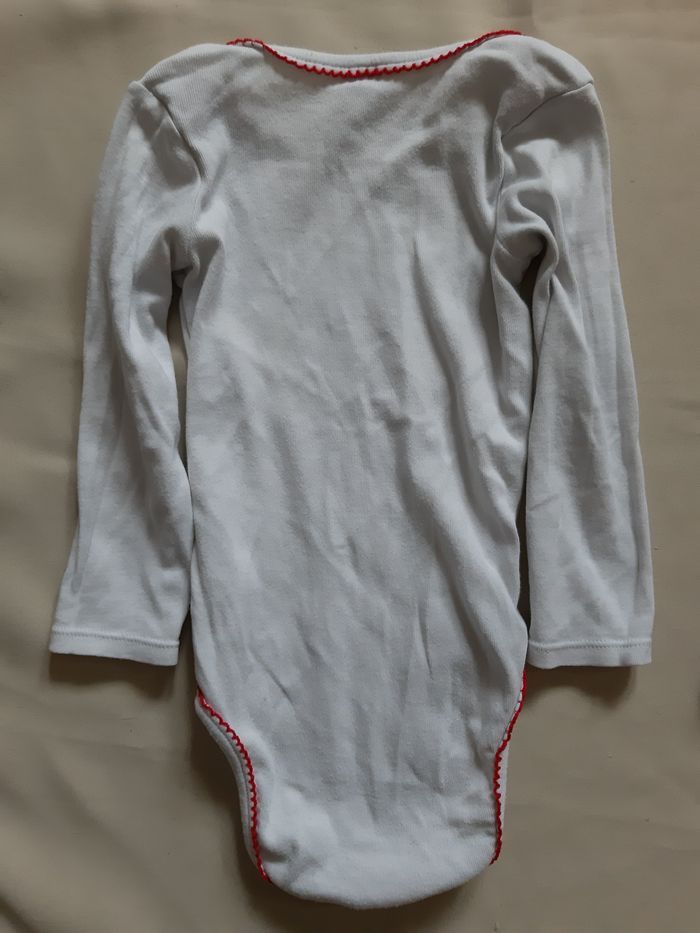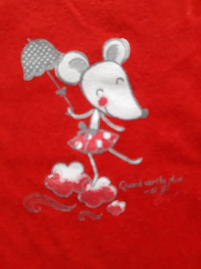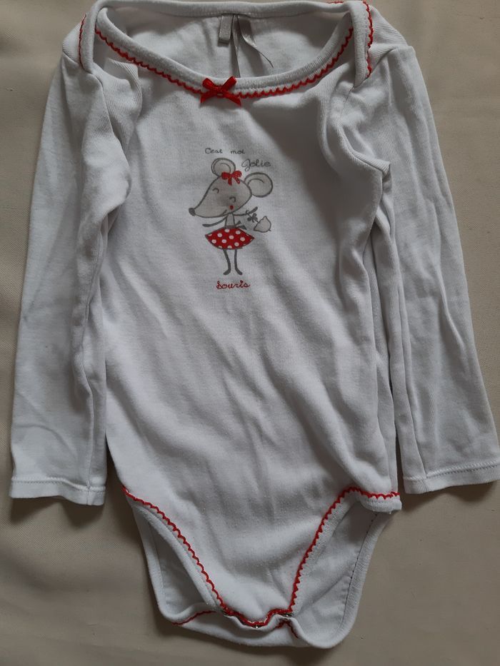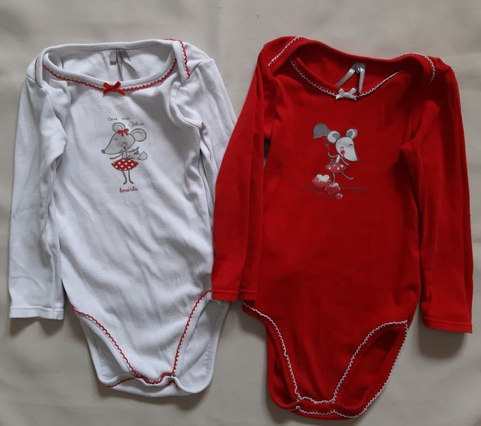 lot de 2 bodies à manches longues, de la marque Orchestra, en taille 24 mois (86 cm) - 1 body blanc, motif souris, inscription "C'est moi jolie souris", avec un petit nœud rouge - 1 body rouge, motif souris avec un parapluie, inscription "Quand vient la pluie moi je souris", avec un petit nœud blanc En très bon état.