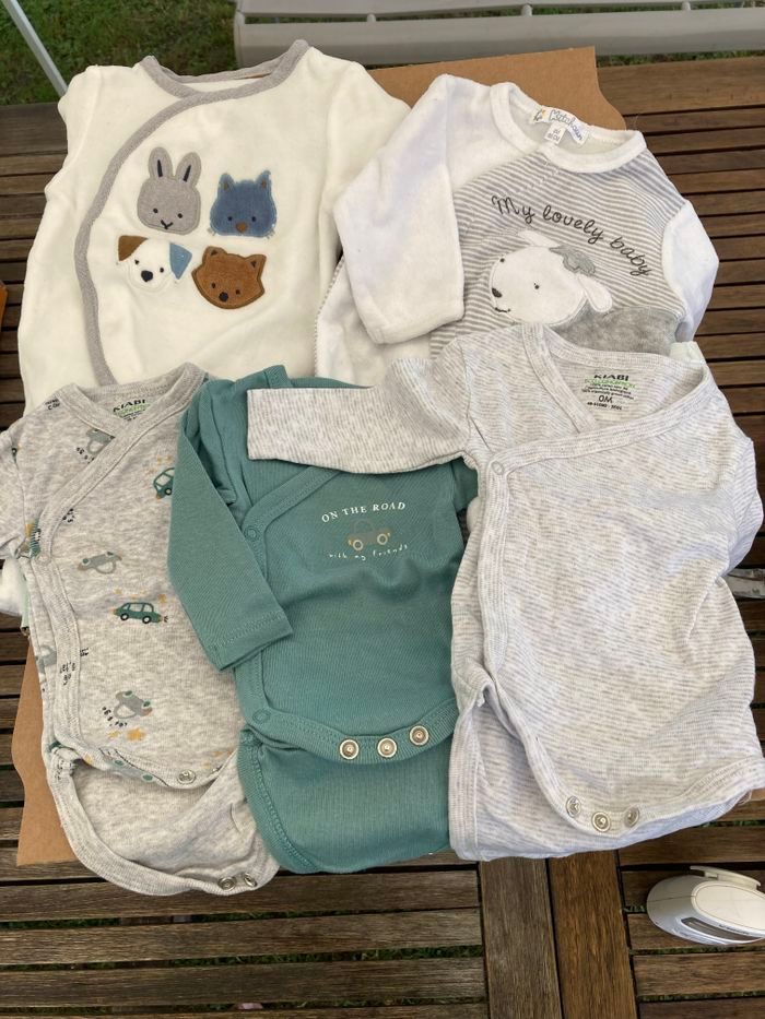 Je vend un lot de 2 pyjamas et 3 bodies manche longue neuf. 1 pyjama de marque obaibi, le reste kiabi.