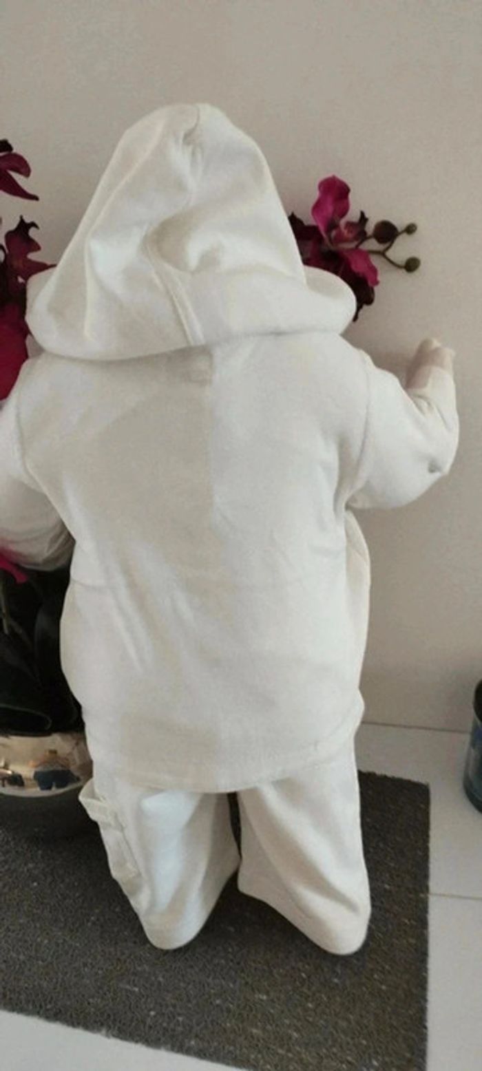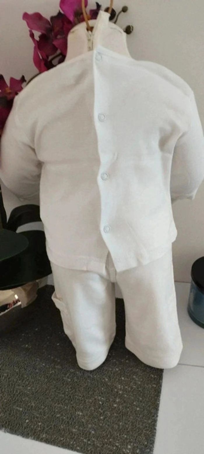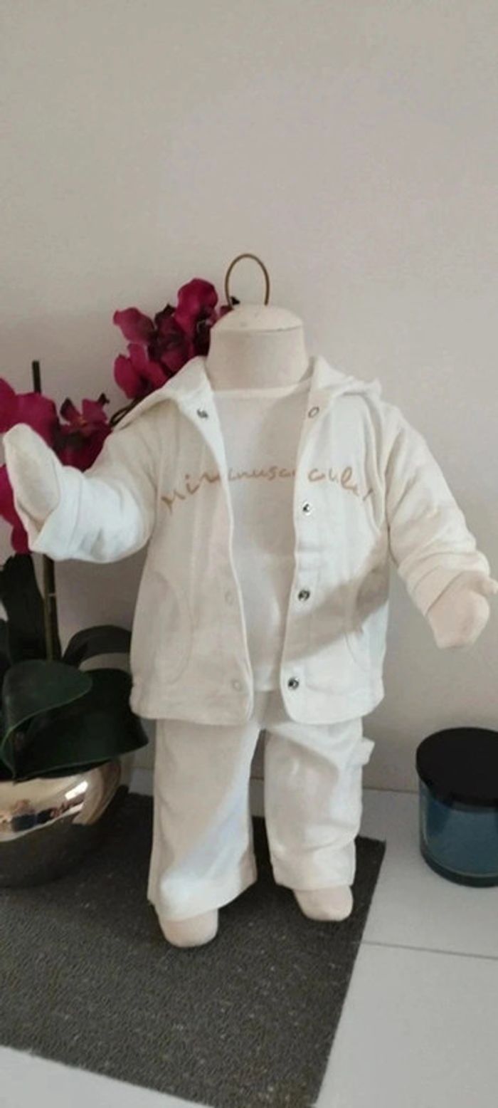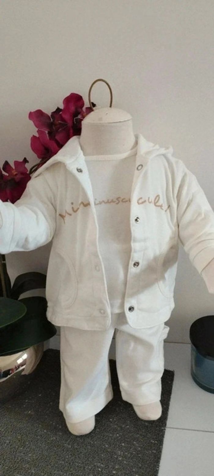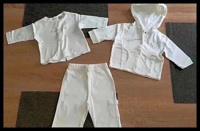 Ensemble 3 pièces veste,tee-shirt et pantalon blanc matière fine idéale mi-saison Taille 3 mois Marque 3 suisses Quelques imperfections possibles visibles en photos (quelques tâches jaunes du au stockage dans le carton)