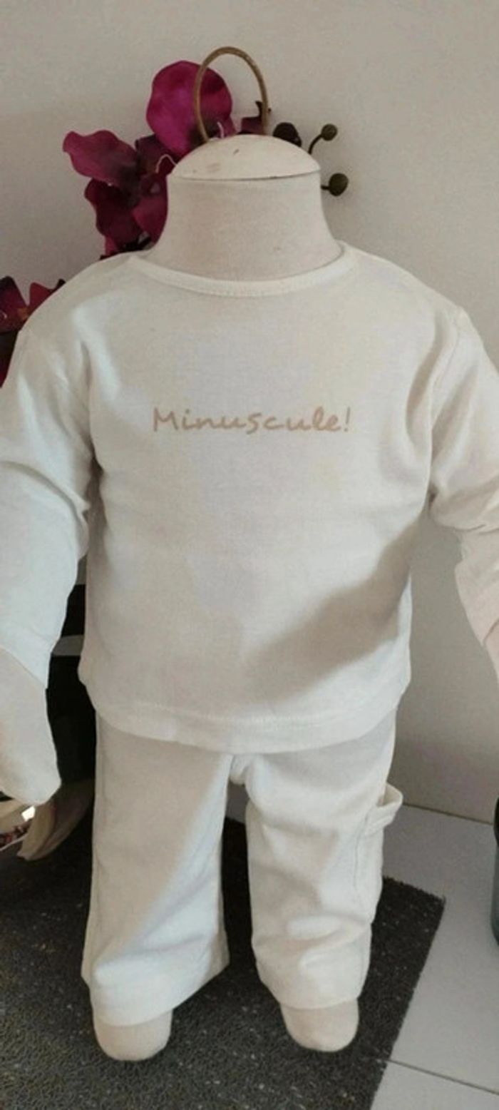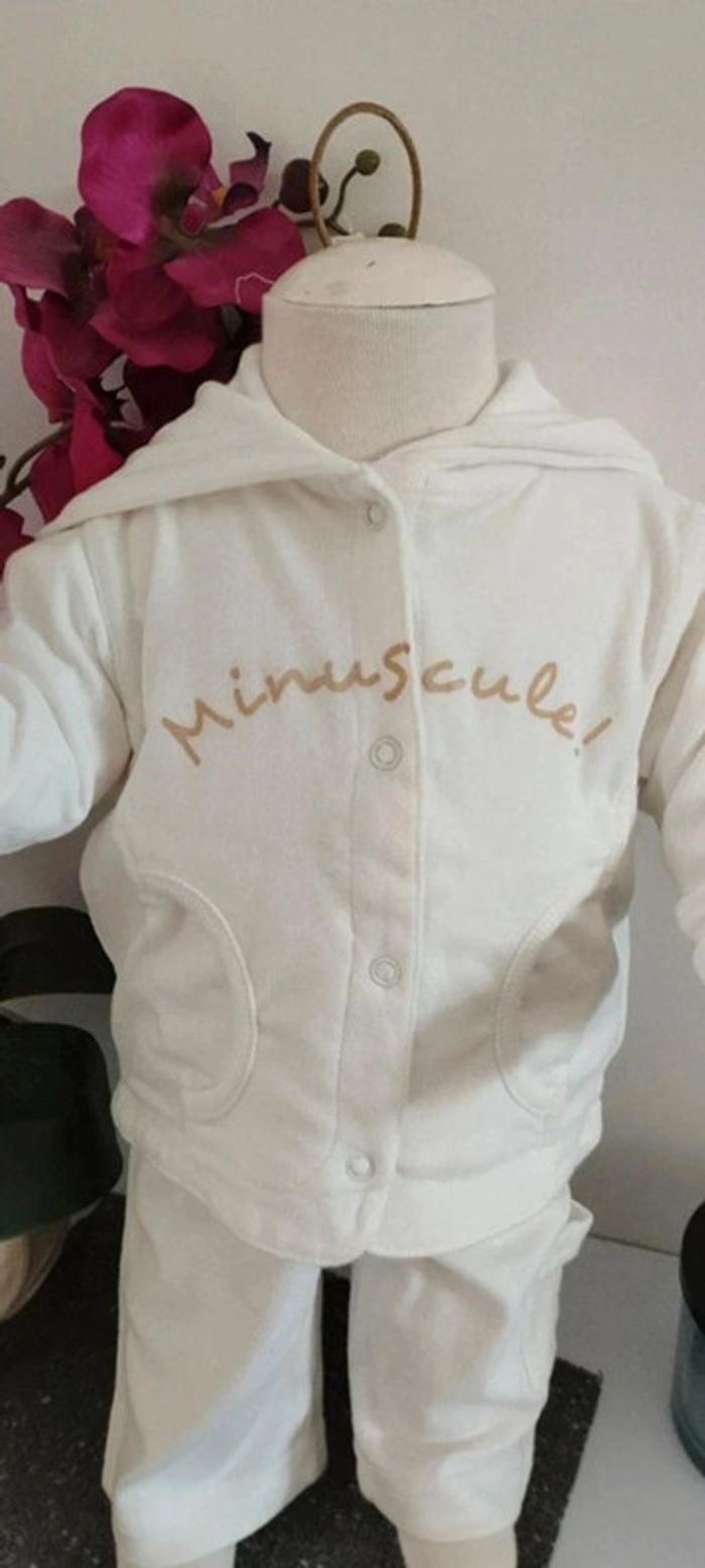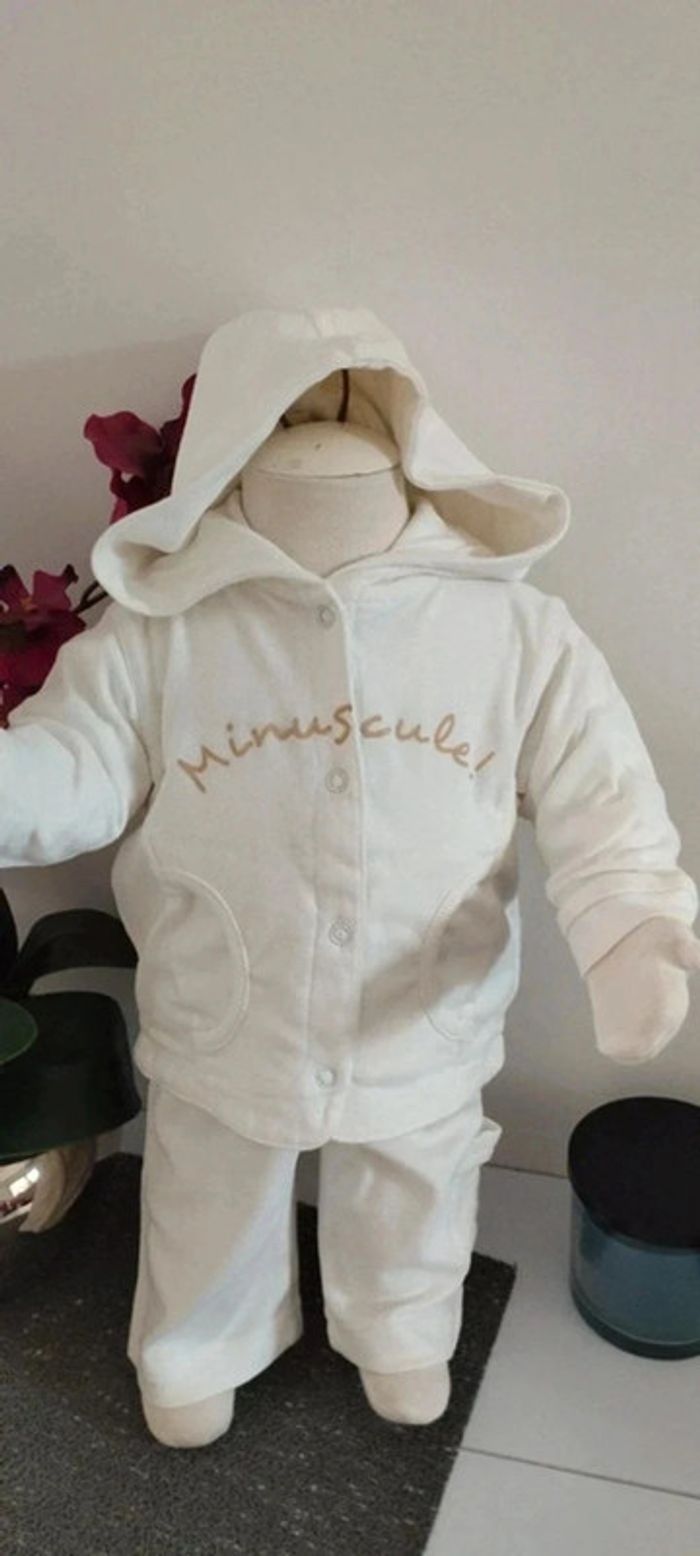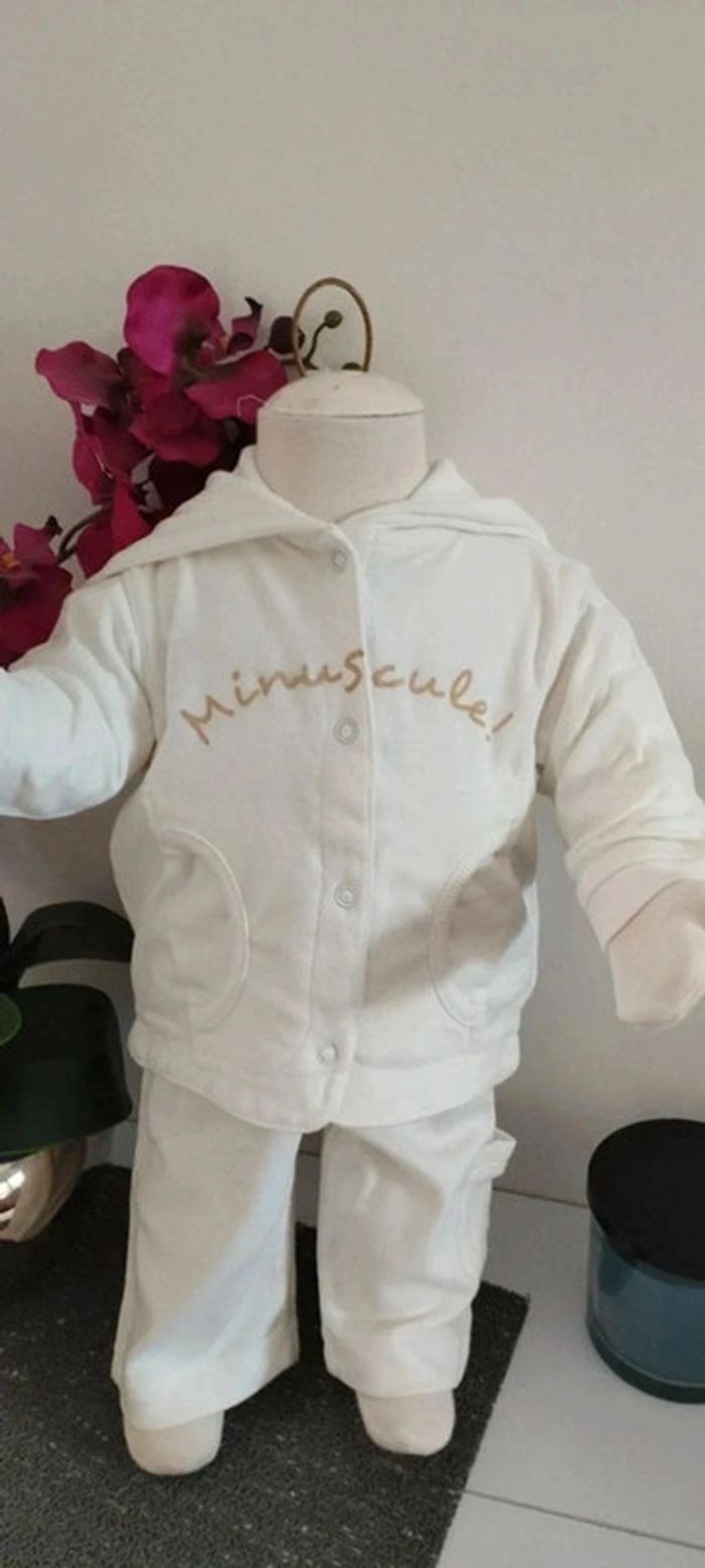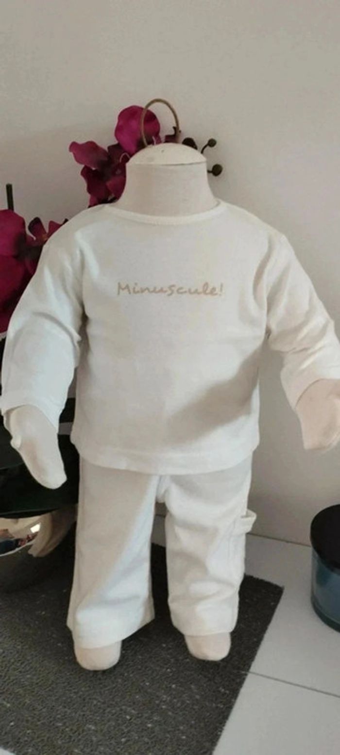 Ensemble 3 pièces veste,tee-shirt et pantalon blanc matière fine idéale mi-saison Taille 3 mois Marque 3 suisses Quelques imperfections possibles visibles en photos (quelques tâches jaunes du au stockage dans le carton)