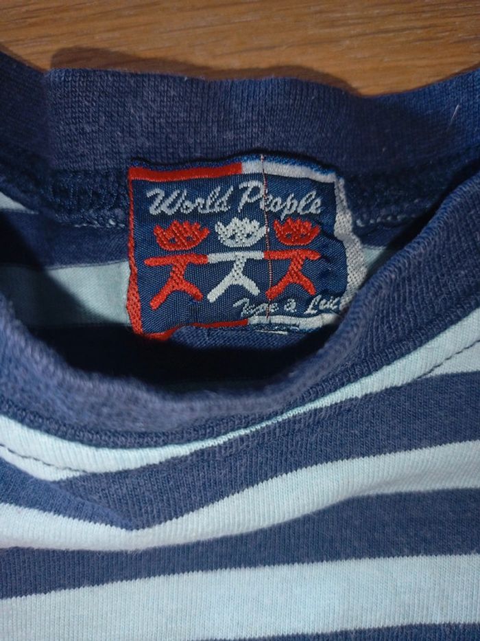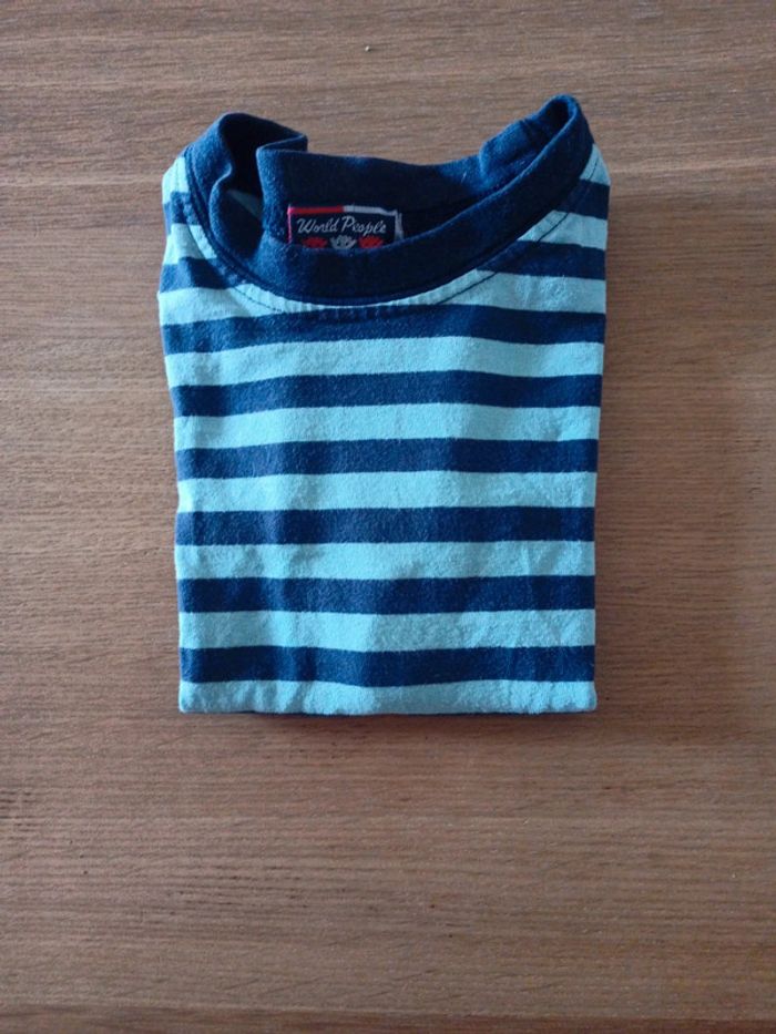 T-shirt bleu rayé, taille 24 mois. Très bon état. Possibilité de faire des lots pour bénéficier des réductions 😊