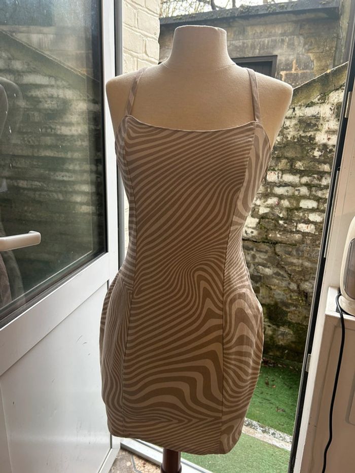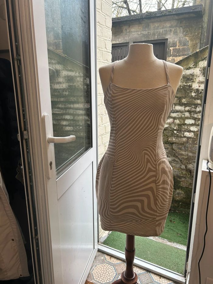 Petite robe d'été à bretelles à imprimé / rayures beiges et taupe