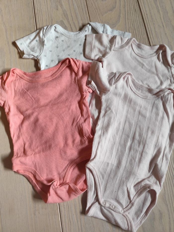 Lot de 4 bodies en bon état, possible traces d'usure - rose foncé Kitchoun - rose clair rayures verticales Tex Baby - blanc pattes animaux Tex Baby - rose clair uni Tex Baby