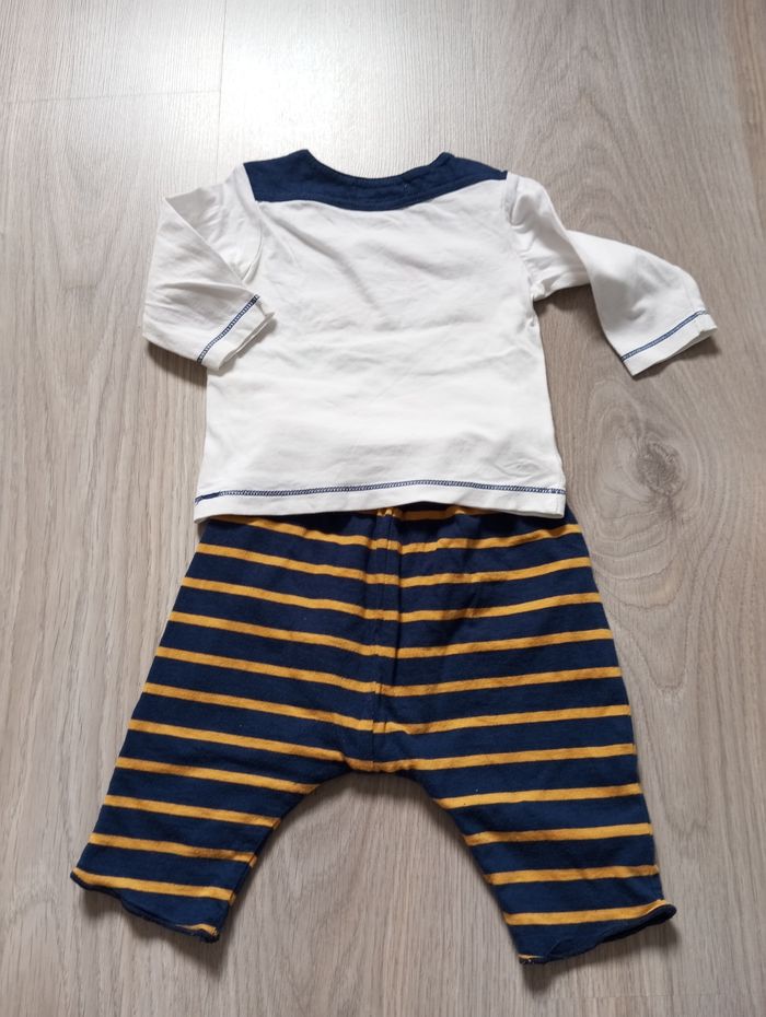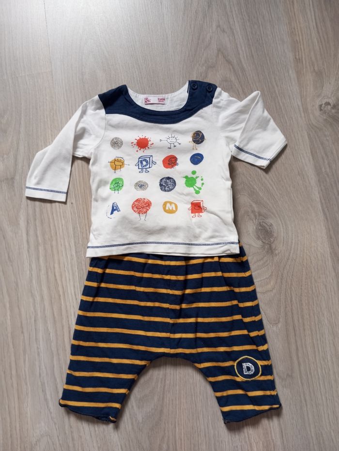 Ensemble bébé garçon, marque Du Pareil au Même, taille 3 mois, 59 cm, comprenant un t-shirt manches longues et un pantalon réversible.