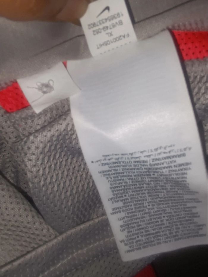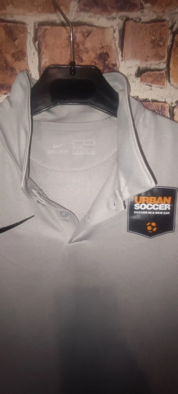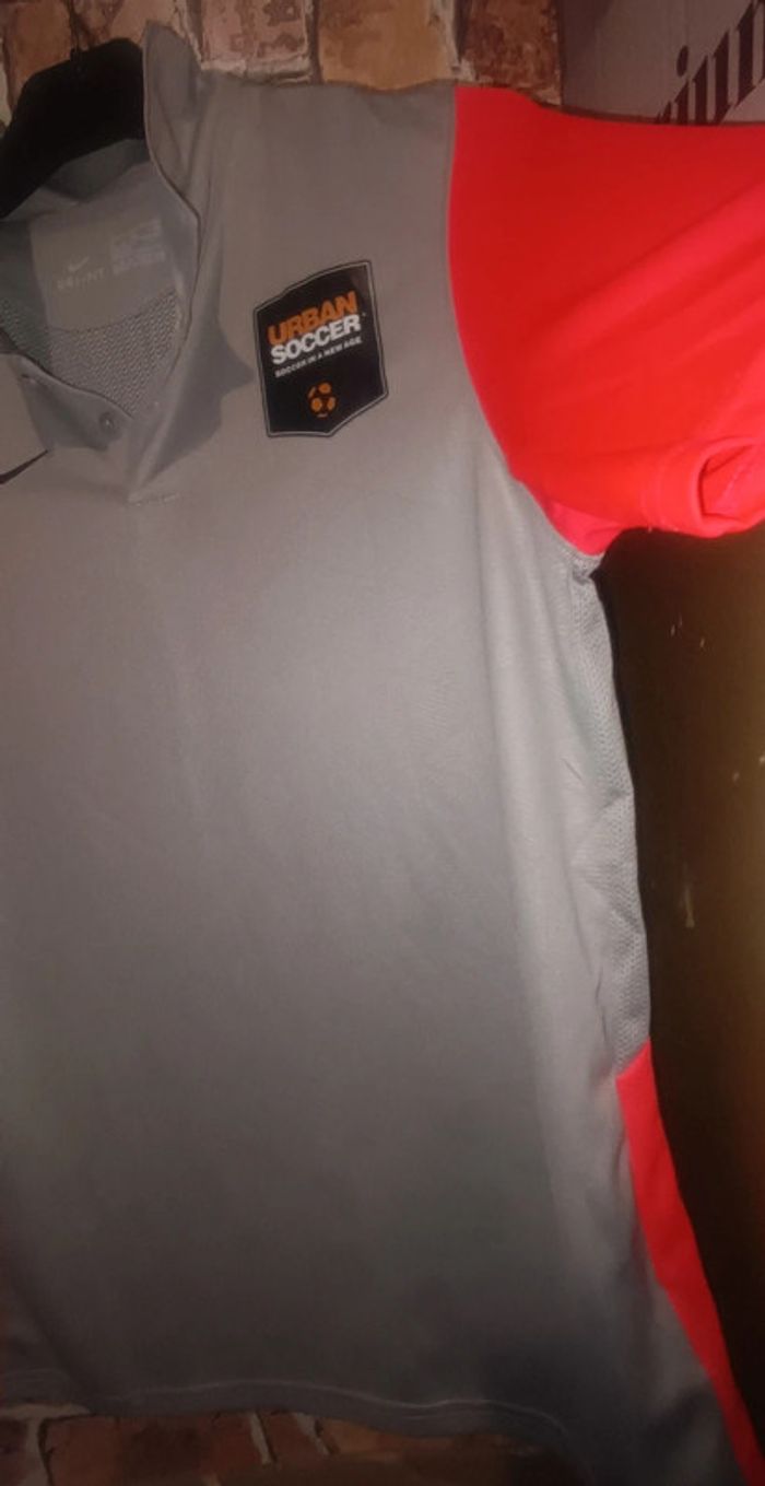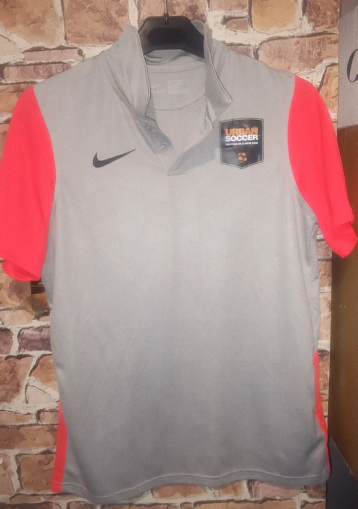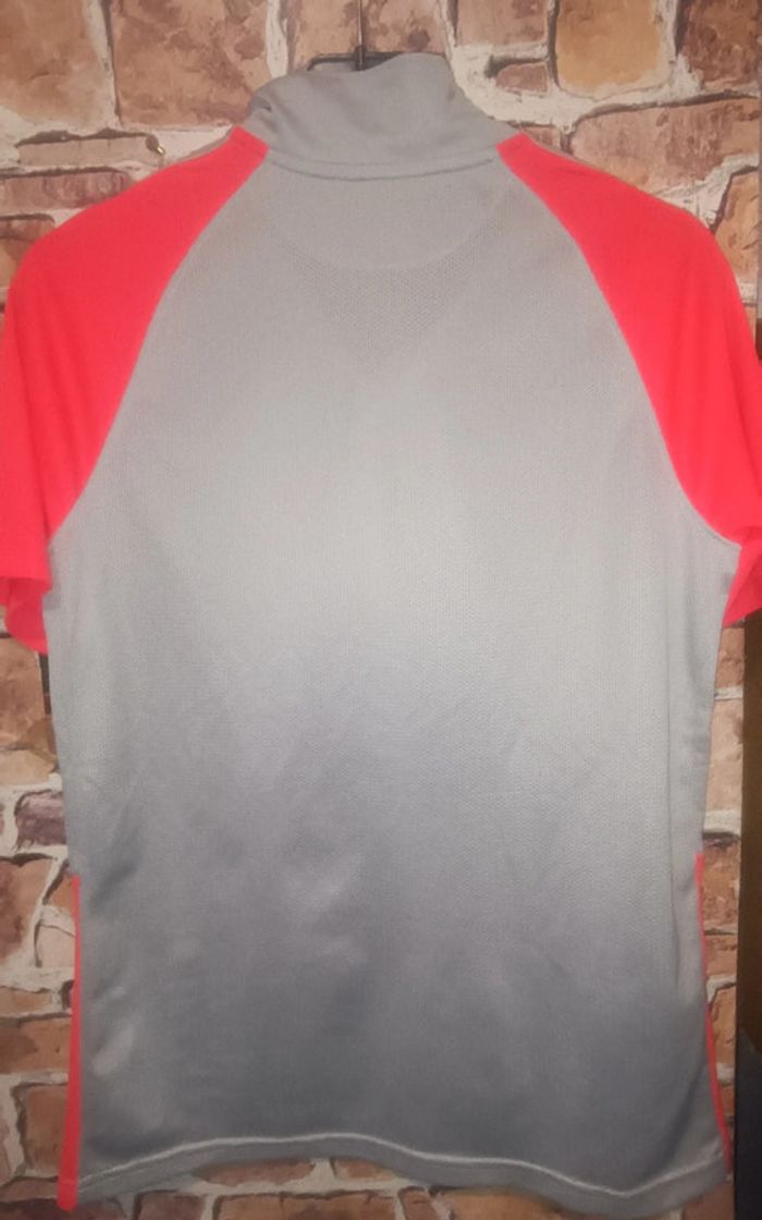 Polo de sport couleur gris clair et orange avec courtes manches, en très bon état, taille XL enfant, correspond à un S adulte