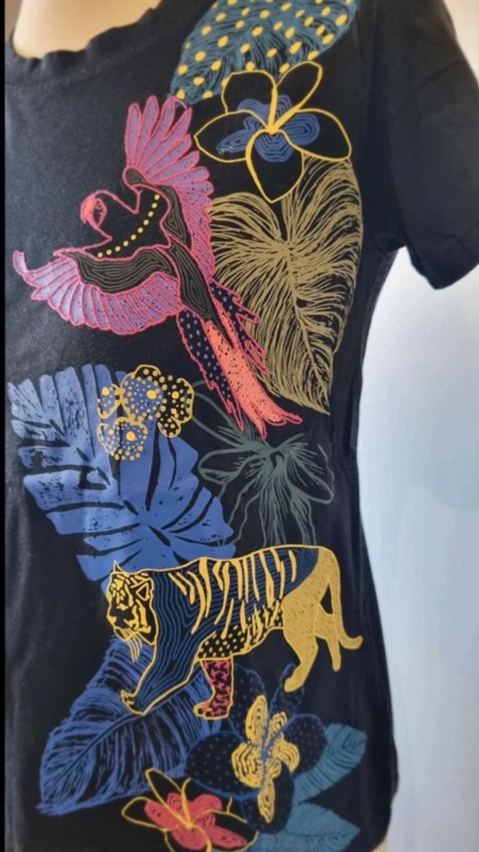 Tres beau Tee-shirt noir à motifs colorés femme de chez cache cache en taille S Jamais porté 50% coton 50% modal #dodie33127_FemmeS #dodie33127_Femme36