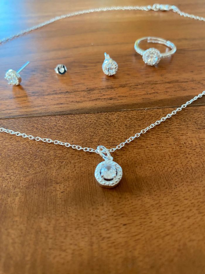 Jolie parure bijoux comprenanr un collier de 45 cm , une paire de boucle d’oreilles et une bague réglable. Hyper brillant ✨ plaqué argent 925 assurant aucune allergie et résistant à l’eau .