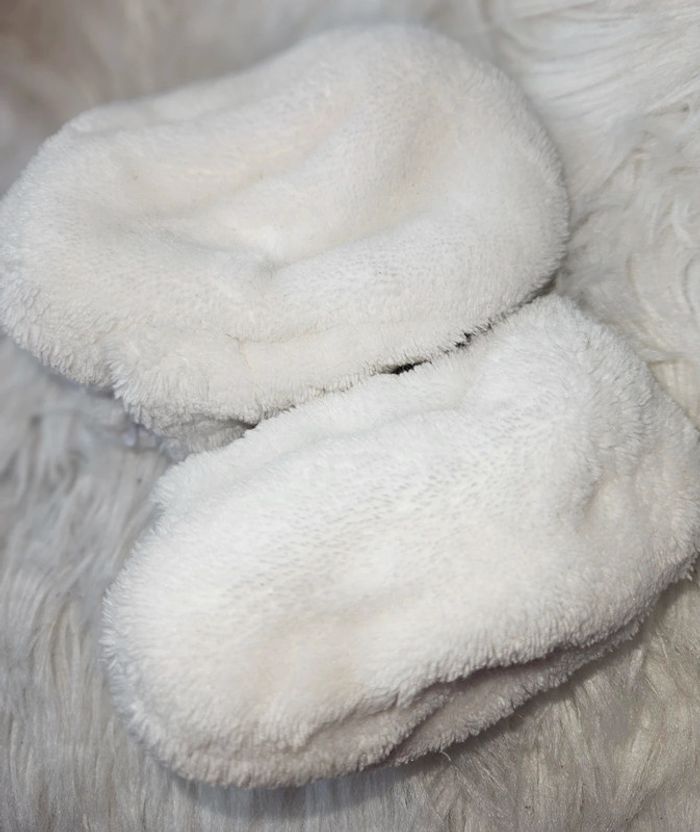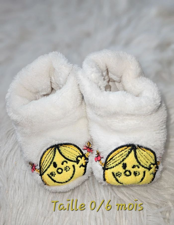 Chaussons blancs tout doux à l’effigie de Monsieur Madame. Très bon état, aucun défaut. Peu portés. Taille : 0 à 6 mois. Prix ferme : 2 €