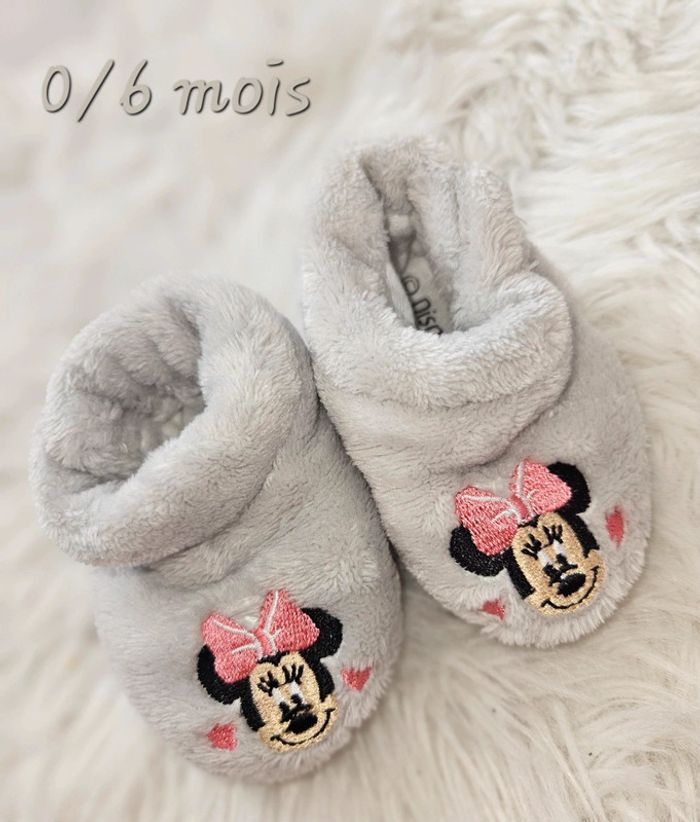Chaussons gris tout doux à l’effigie de Minnie (Disney), adorables et confortables pour bébé. Très bon état, aucun défaut. Peu portés. Taille : 0 à 6 mois. Prix ferme : 2 €