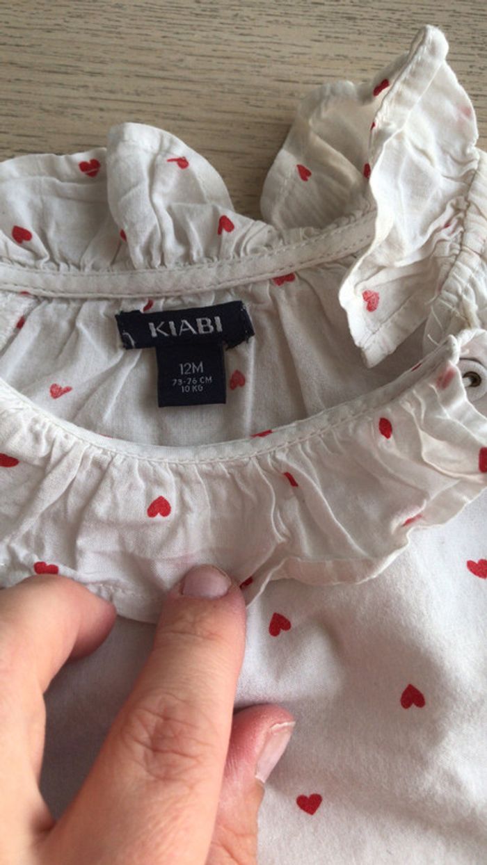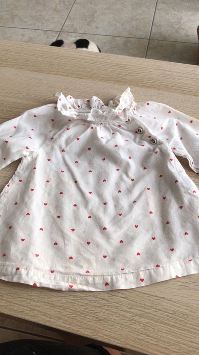 9 mois portée une fois j’offre la deuxième blouse blanche cœur car un peu tachée