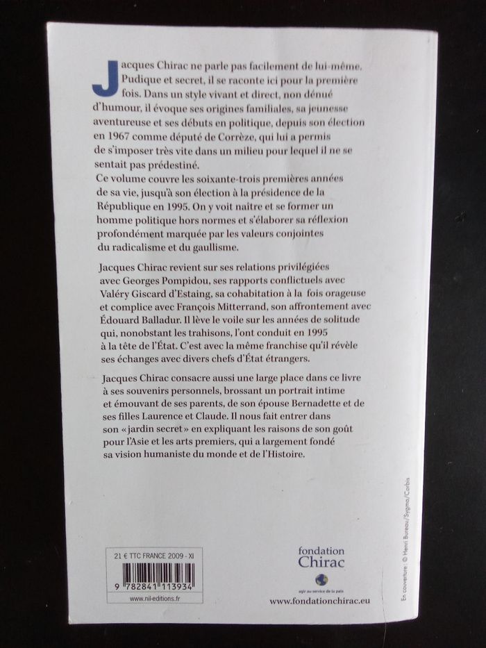 Livre de 499 pages retraçant la vie de Jacques Chirac. Bon état général. 2 autres livres roman également à vendre ds mon dressing et réduction activée
