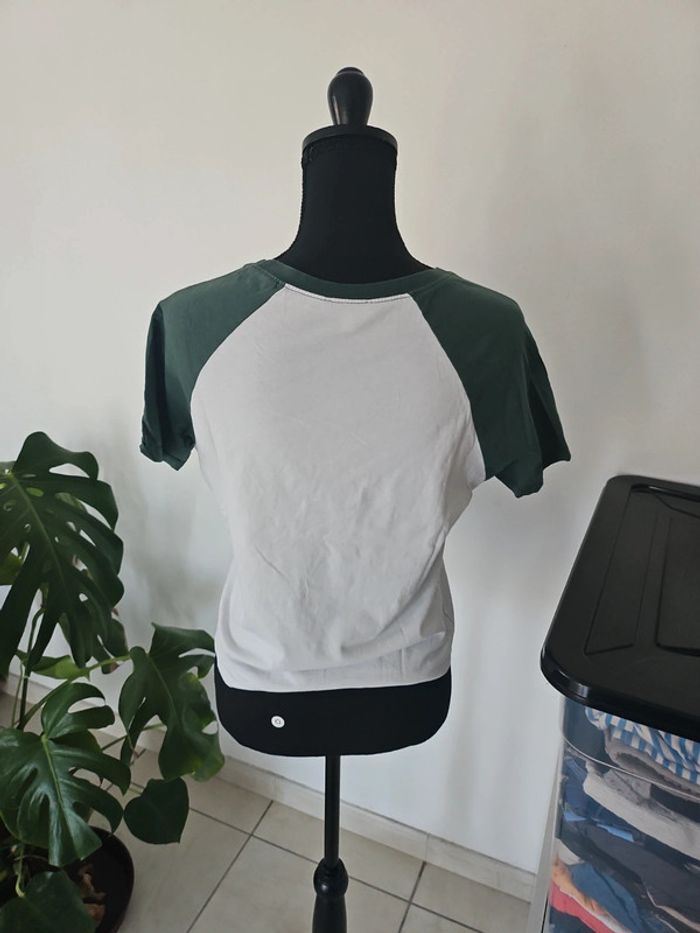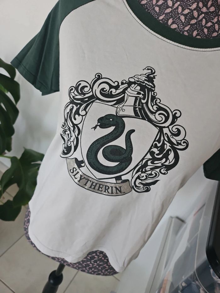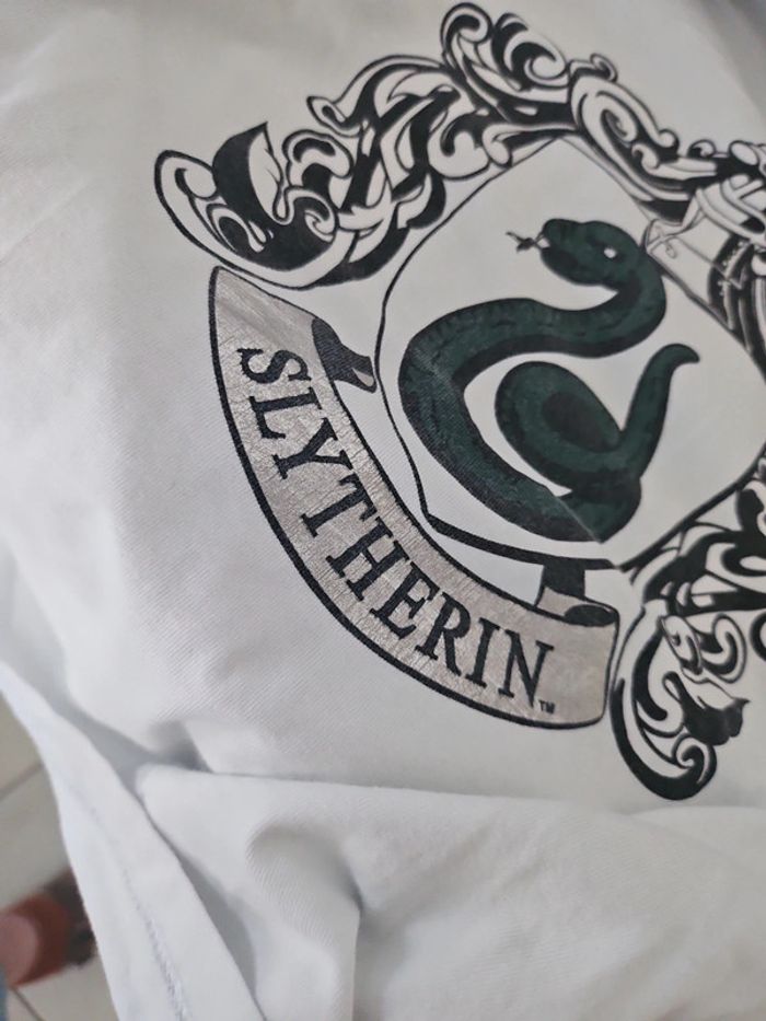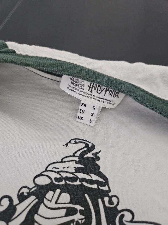 🗂 Catégorie: #amandinebontaille36sfemme 📏 Taille: S ®️ Marque: Harry Potter 🎨 Colories: Blanc et vert foncé 🌻 Thème/motif: Flocage serpentard 💐 Détails supplémentaires: Crop top manches courtes. Pas de photos portées. Mis en vente le 17.05.25