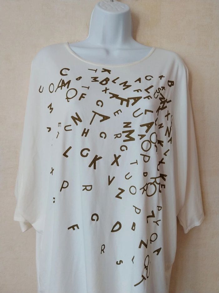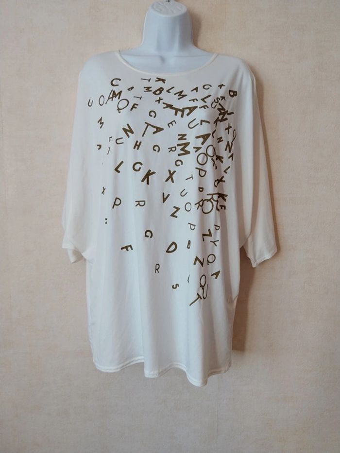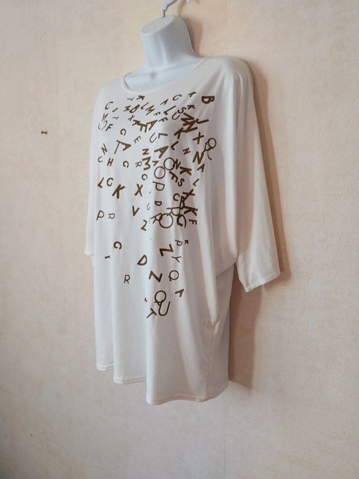 Blouse manches courtes Blanche et imprimé lettres Taille 46 48 Longueur 73cm Très bon état Envoi rapide et soigné #sigrid14femmes46 #sigrid14femmes48 #sigrid14mai2025