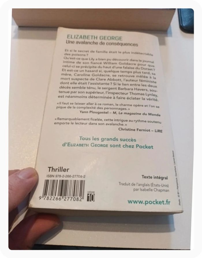 Livre Elizabeth George Poche Une avalanche de conséquences Bon état Couverture un peu abîmée 📦 Envoi rapide et soigné #sigrid14livres #sigrid14thrillers #sigrid14mars2025 Synopsis Entre Londres et le Dorset, on plonge dans les secrets, mensonges et méandres d'une famille dysfonctionelle marquée par le suicide du fils cadet, Will, le fragile paysagiste atteint de logorrhée verbale
