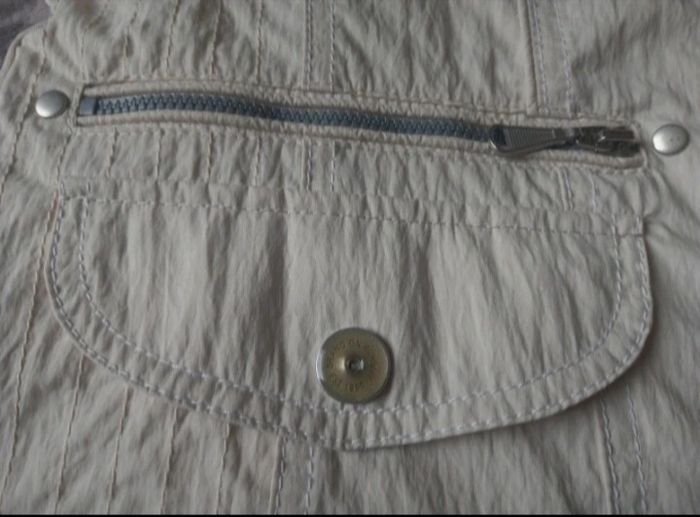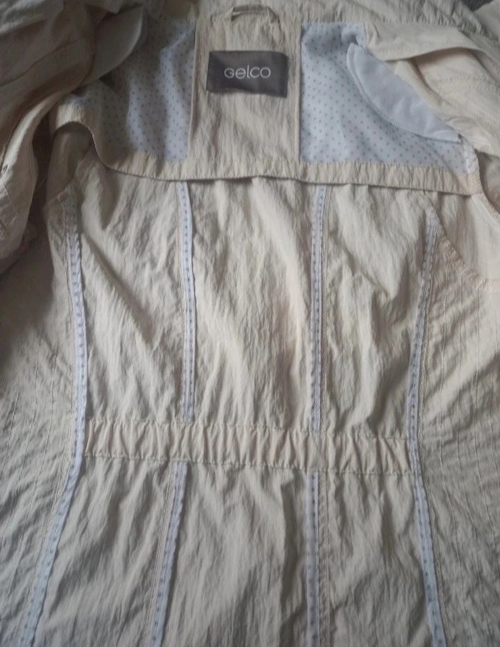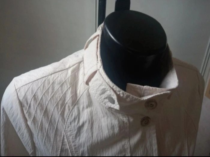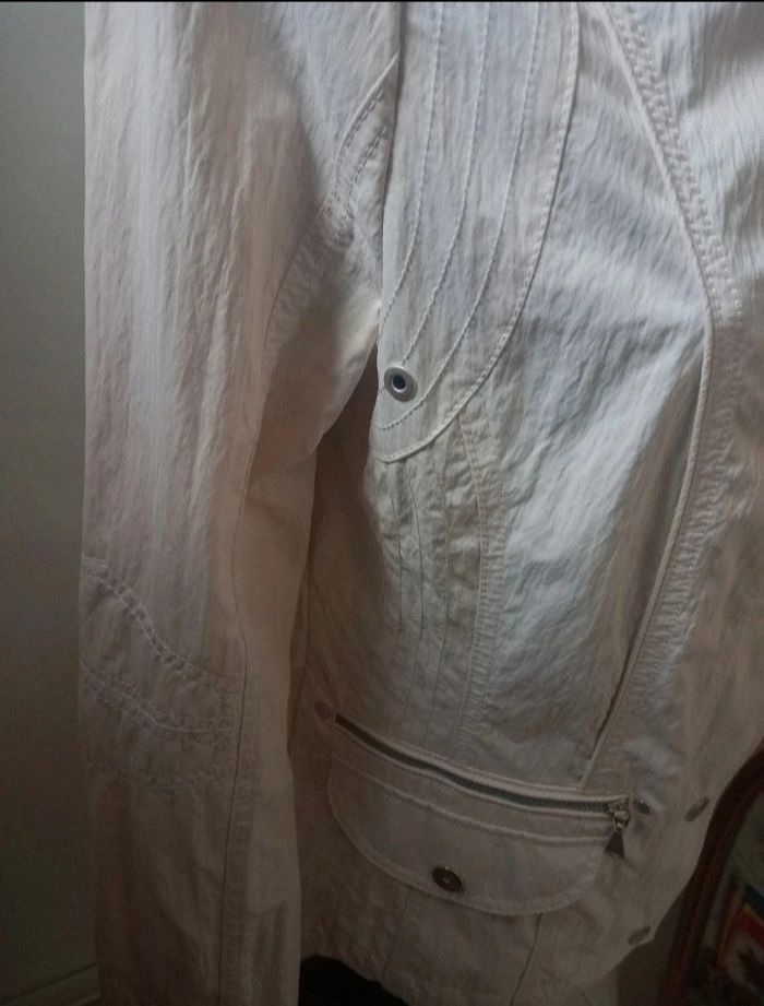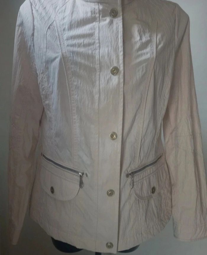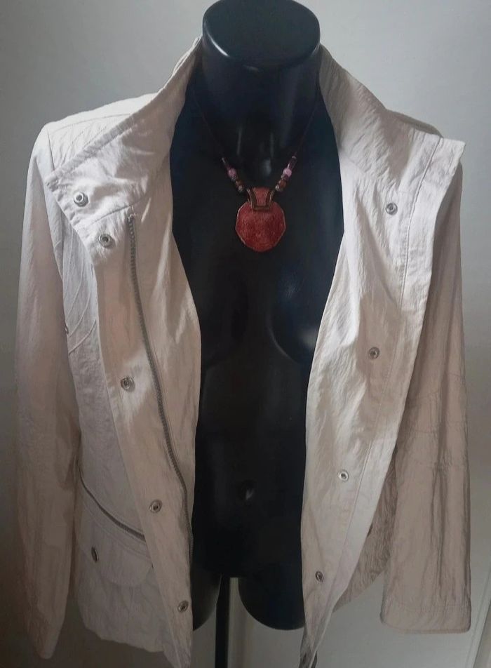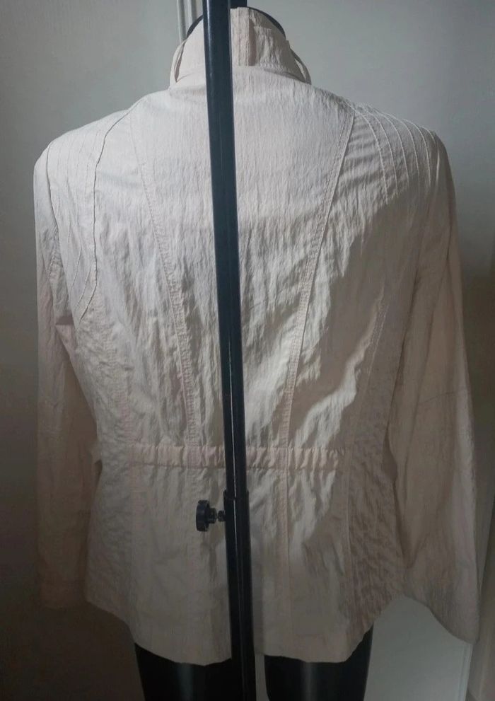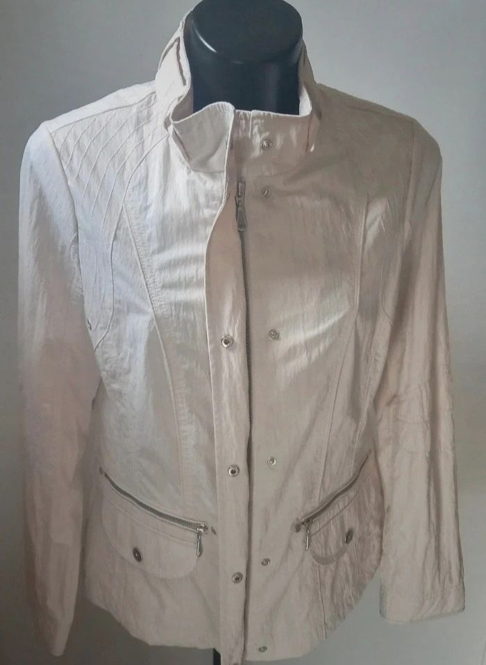Très belle veste coup vent Coloris crème Excellente état porté 1 fois Fermeture éclair plus boutons-pression 2 grandes poches Fermeture éclair. 100% polyester Dimensions Longeur 63,5 cm Épaules 40 cm Manche 63,5cm Aisselles 50 cm Envoie soigné avec mondial relay ou Chronopost N'hésitez pas à regarder mes autres offres Réduction sur lot . Merci de votre visite .