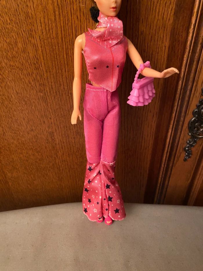 Comprenant : - gilet rose sans manche - pantalon patte d’éléphant - écharpe - chaussures - sac à main