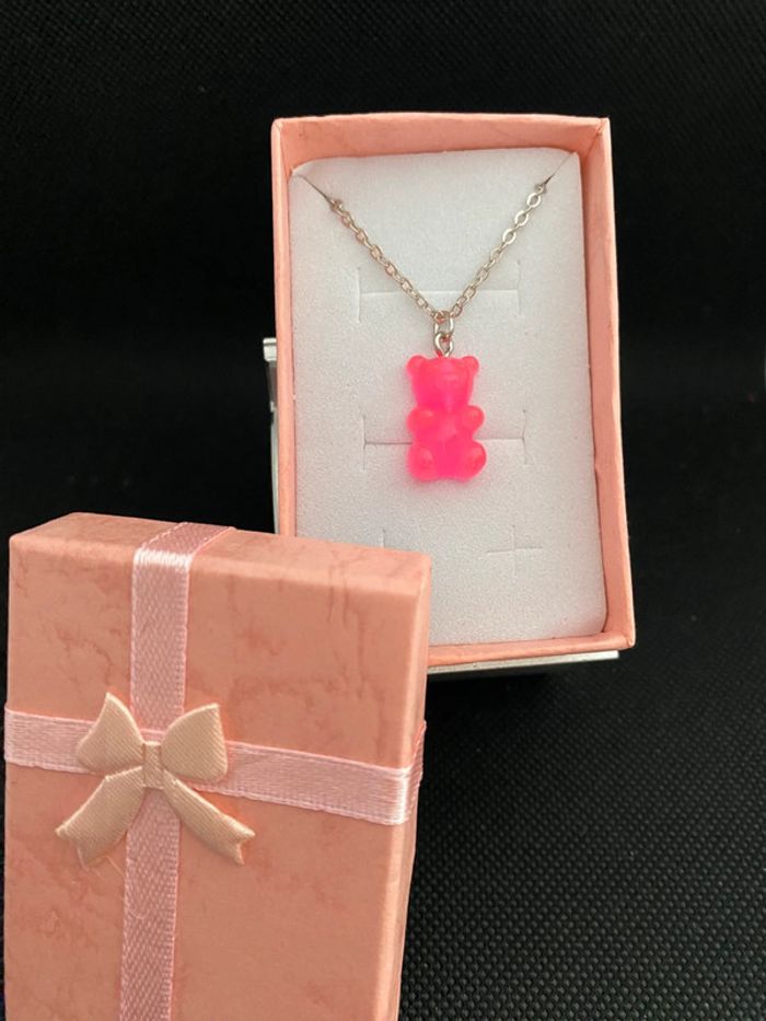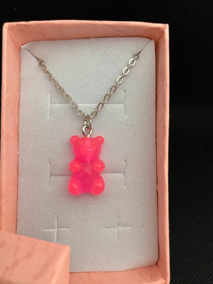 Collier argenté pendentif nounours guimauve rose - photo numéro 2