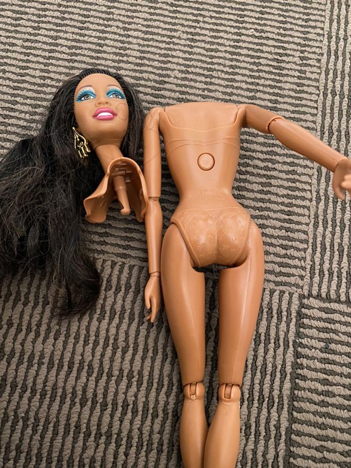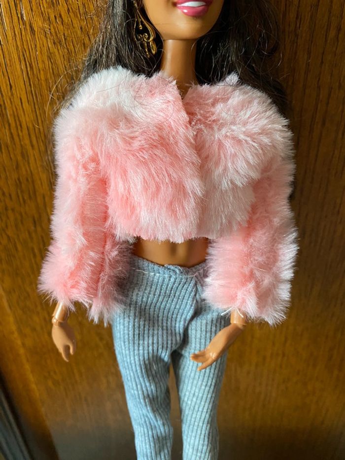 Comprend La barbie avec 1 boucle d’oreille Haut rose en fausse fourrure Pantalon gris Baskets blanche Bonnet gris Le bouton au dos permet de retirer le buste avec la tête voir photo