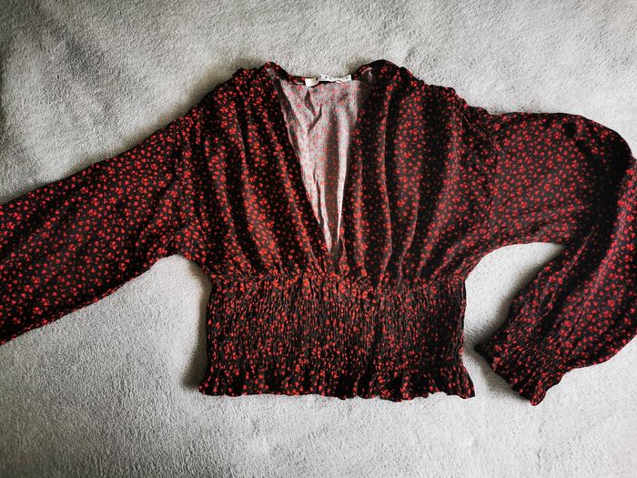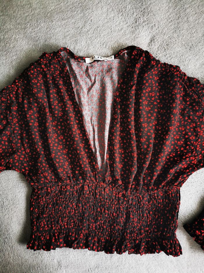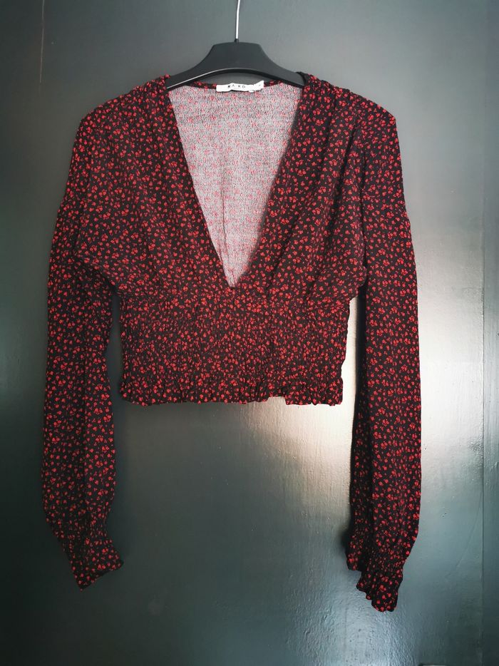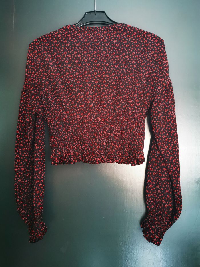 Top court NA-KD fleuri, stretch au ventre, manches bouffantes, bon état.