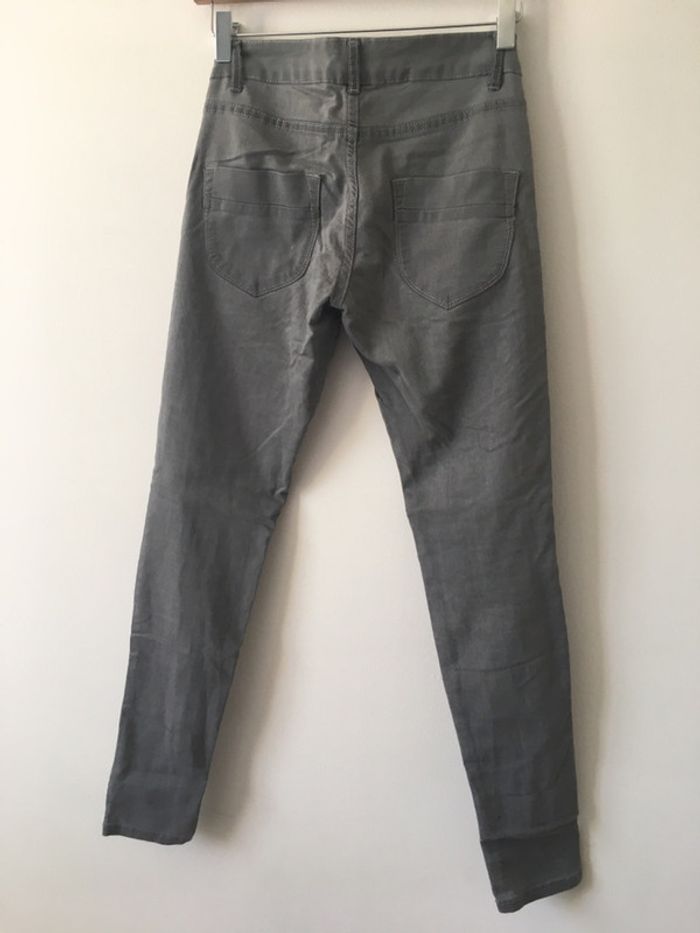 • Skinny gris taille xs Porté, mais très bon état ormis des "files sortis" derrière la jambe droite, se vois à peine. taille normal, matière fine ,légère et élastique.