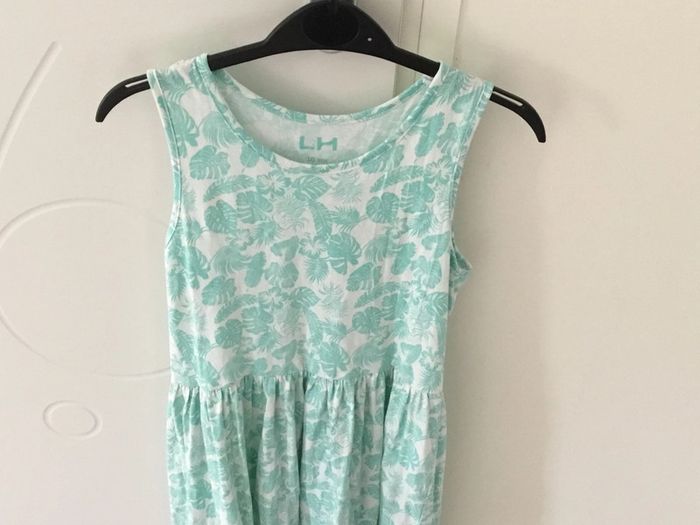 Jolie petite robe blanche et turquoise à manches courtes avec des motifs feuillages Très bon état Taille 10 ans Maison non-fumeur Envoi rapide et soigné